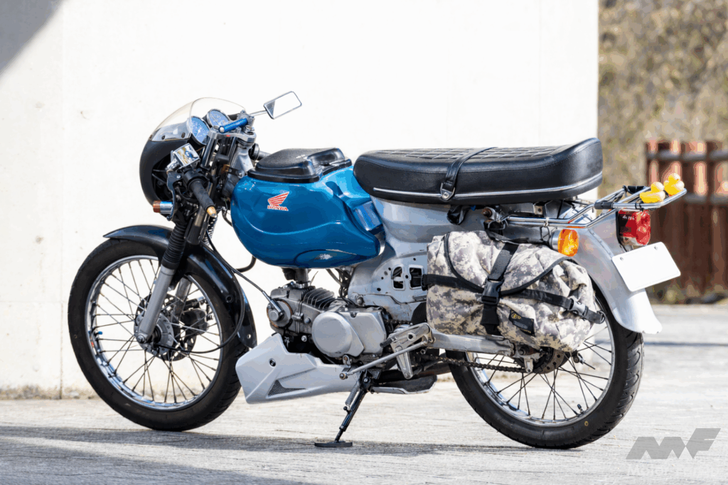 エンジンは社外125ccへ換装。アクラポビッチの他車種用サイレンサーをワンオフエキゾーストでドッキングするなど、流用と加工の組み合わせも巧みだ。腹下の空間を埋めるためにモンキー用アンダーカウルを装着し、ビキニカウルと相まってレーシーなルックスを構築している。