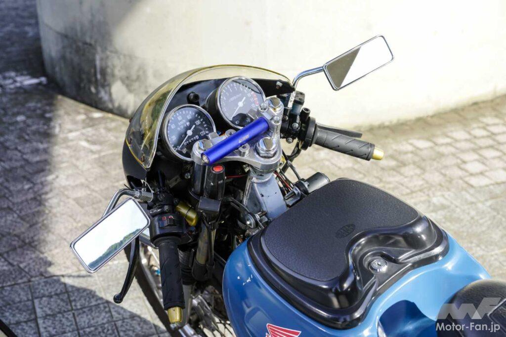 東京堂のセンターボックスを活用してダミータンクを製作。そこへセパレートハンドルとバックステップを組み合わせ、真逆ともいえる前傾ポジションへと進化させた。伏せて乗るその姿は、まさに修行系。
