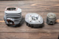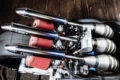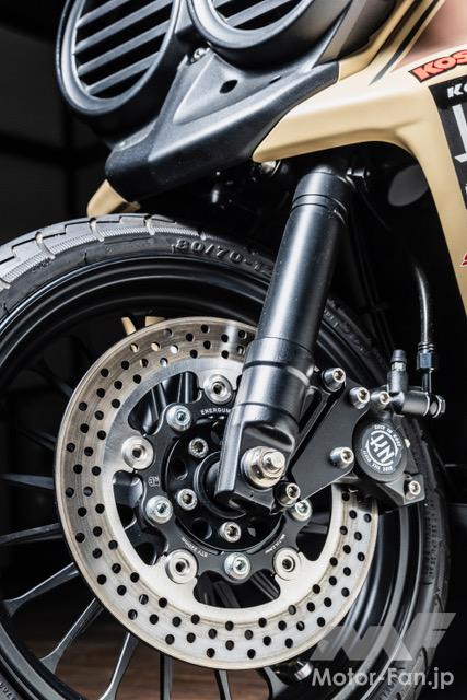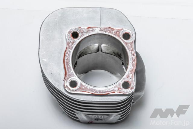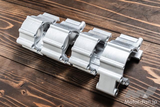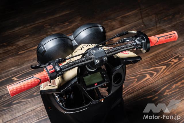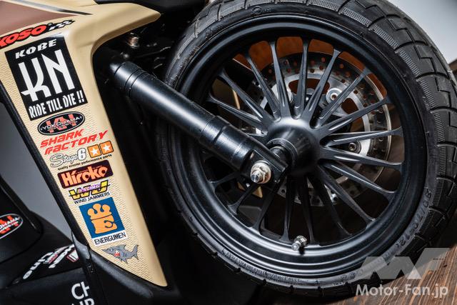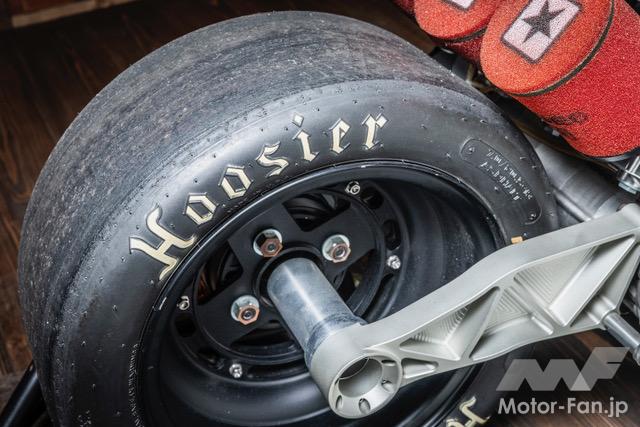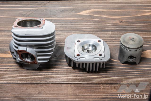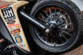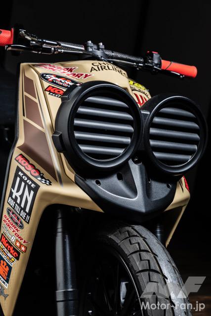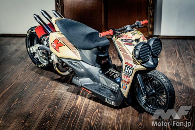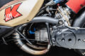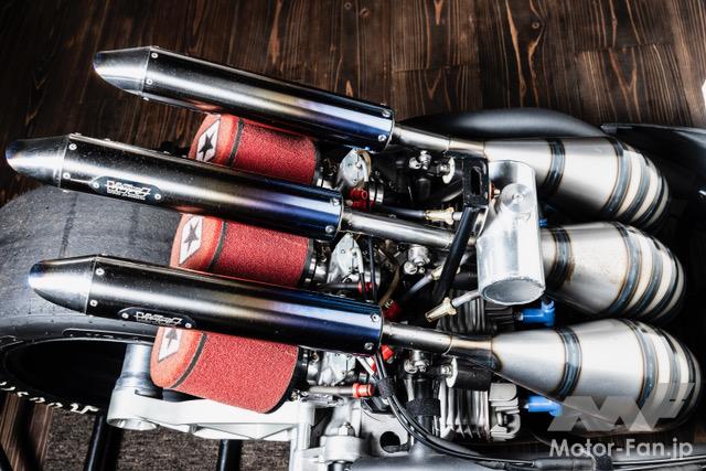 バイクカスタム 2ストローク3気筒、405ccのBW’S50!【写真・6枚目】 135㏄のKN企画製シリンダーを3基並列に並べたBIG Bの心臓部。ワンオフで作られたアルミ製のガソリンタンクはSS1/32mile(50.29m) を走り切るためだけの容量に設定されている。 3気筒を実現するために ワンオフで製作されたク ランクケース。左右は BW'S100用を使用し、 中間部には4分割された このケースが用いられる。ゼロベースで図面を起こして制作されている。 シリンダーハイトを4㎜延長する設計で、ロング ストロ ーク にも 対 応 す るKN 企 画 のBW'S100用アルミメッキシリンダーボアアップ キット。ピストンφ57㎜とし、ノーマルが6.5㎰のところ14㎰にパワーアップする逸品だ。 排気ポートにはレーシングマシン同様のセンターリブが盛り込まれ、ポートの数は9個となるアルミ製メッキシリンダー。 リヤホイールは四輪用のSSR MkⅡ(8J-13)を加工し、グランドアクシス用のハブを使用して装着。高い剛性を感じさせるスイング アームはワンオフで製作された専用品となる。 台湾のシェイクダウン時はミッキートンプソン製のドラッグスリックだったが、その後採用されたのはHoosier製のドラッグスリック。サイズは7.0/20.5-13。 エクステリアの細部にまで気を配る佐々木氏だけに、BW'S50のチャーミングなフェイスを活かした雰囲気作りが施されている。 フロントホイール、φ220mmブレーキディスク、2ポット鍛造キャリパー、フロントフォークはKN企画で販売されてる商品を使用。 アルミ鍛造の削り出しで作られるホイールはKN 企画で市販されている2.5J-12インチサイズ。タイヤはKENDA 製でサイズは 80/70-12。 ハンドルや左右のブレーキレバー、ハンドルポストはMTB用を流用。キルスイッチはホンダ、NSF100用を流用使用している。 この画像の記事を読む
