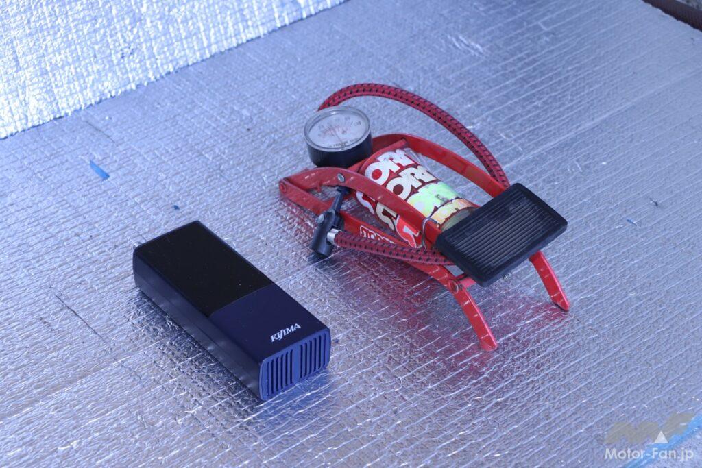 これまで使っていた足踏み式ポンプと大きさを比較してもその差は歴然! スクーターのフロントポケットに入ってしまうほど小さいし、500mlペットボトルより軽い428g。