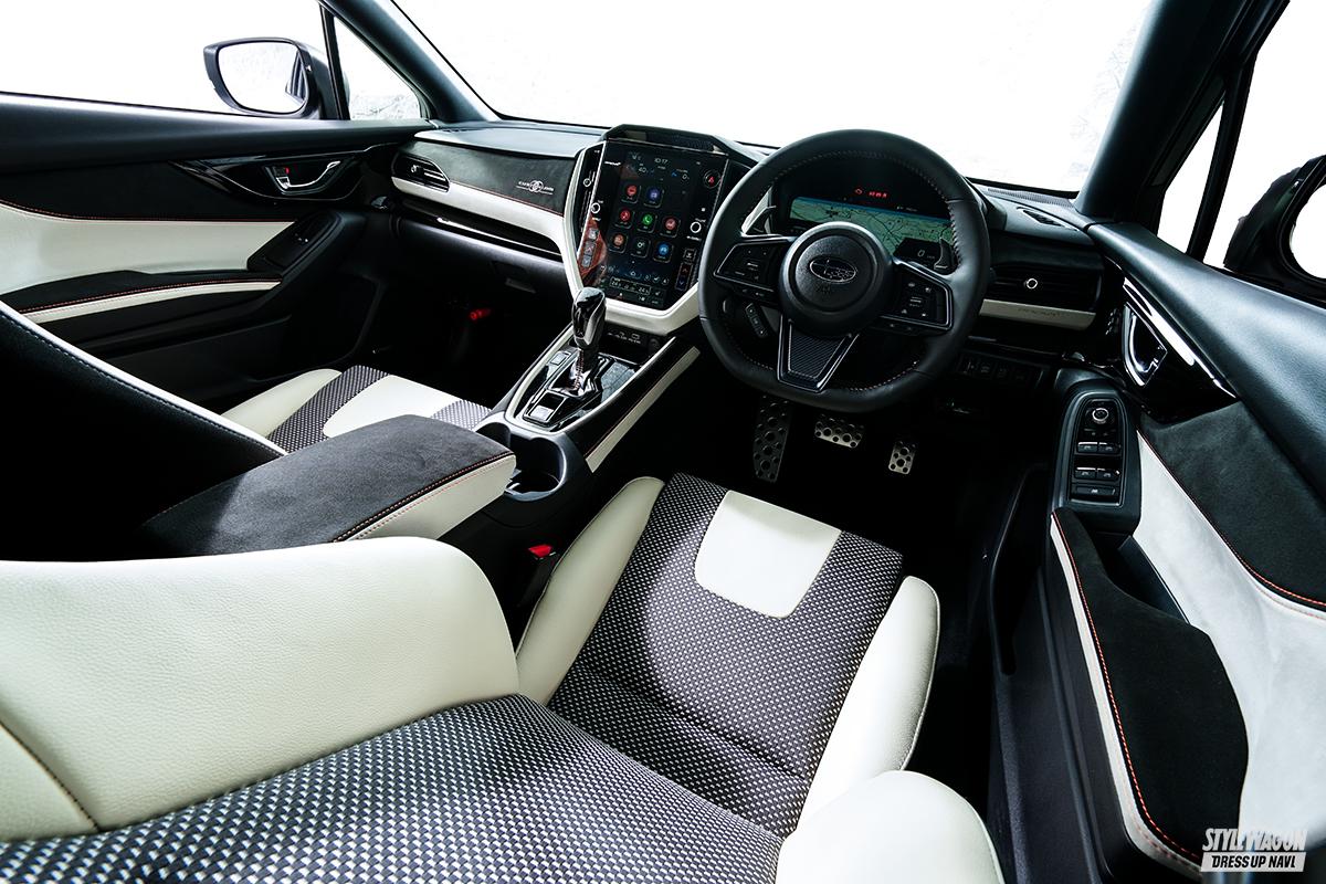 まずはエクステリアだが、スバル純正アクセサリーのプレミアムアーバンパッケージをベースにSTIやバリスのスポーティアイテムをミックスし、スピード感あるスタイリングを構築。精悍さ高まるモノトーンコーデはインテリアにもリンクされていて、ワンランク上の存在感がトータルで引き出されている。