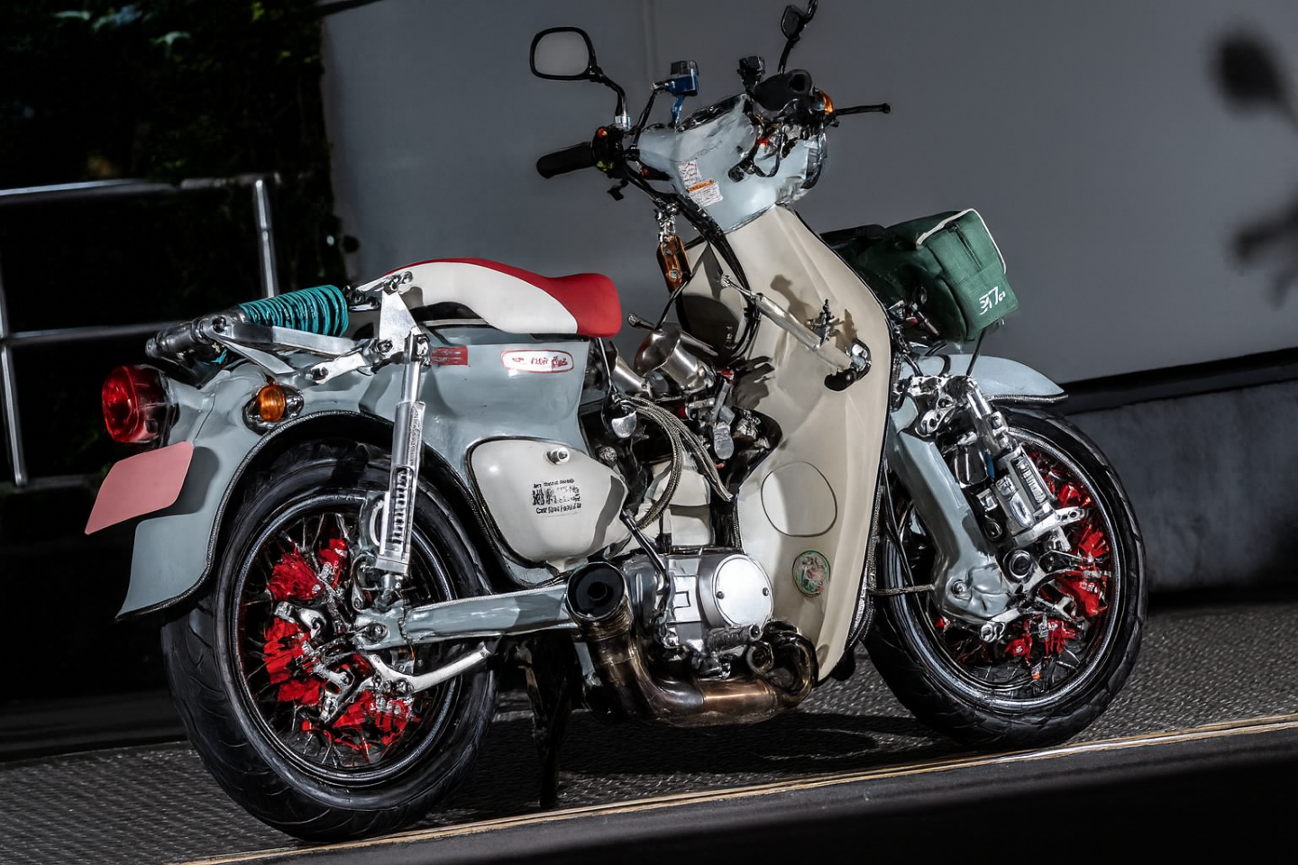 バイクカスタム 「すぐロックします!」リトルカブにキャリパーが12個!? さらに電動サスなど、小さな車体にぶっ飛びメカ満載!【スーパーカブカスタム】【写真・7枚目】 主にブレーキやサスの変更(追加)により車重は大幅に増加。大量のキャリパーはもちろん、リモコン式電動サスにより前後独立で車高調整できるのもポイントだ。 キャリア部分に専用マウントを設け、中・大排気量車向けサスを水平にレイアウト。ファニチャー用の電動シリンダーを介して作動する独自機構となっている。 125cc化したエンジンにはワンオフのインマニを製作し、CB125用YDφ28キャブレターをダブルでセット。ロングファンネルも自作というこだわりだ。 前後左右すべてをディスク化し、各ローターにRCB製2ポットキャリパーを3基ずつ装着。合計12キャリパーという異次元ブレーキを備えた“過剰性能”仕様のリトルカブだ。 リヤホイールにも3基のキャリパーをレイアウト。キャリア部に水平マウントされたサスとリンク機構が、この車両最大の見どころ。 フロントも同様にトリプルキャリパー仕様。ÖHLINSロゴ入りユニットと組み合わせ、制動力はまさにオーバースペック。 125cc化したエンジンにワンオフインマニ+YDφ28キャブをダブルでセット。極太エキパイのワンオフマフラーも迫力十分。 ファニチャー用電動シリンダーを応用したリモコン式サスペンション。前後独立で車高調整できる独創的なシステムだ。 左右に独立したマスターシリンダーとスイッチ類を配置。増設された制御系が、この“工業芸術”の思想を物語る。 この画像の記事を読む