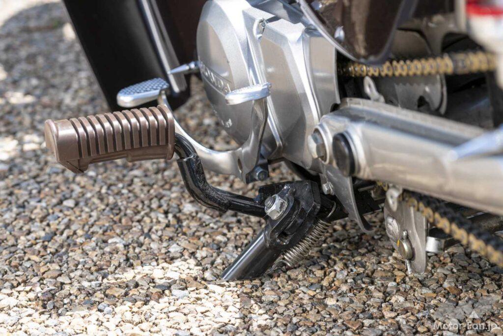 一方で車体側はあえて純正ルックを貫く。マフラーも地上高確保のためノーマルを維持し、変更はリヤキャリア、ショートミラー、ブラウンのステップラバー程度にとどめる。ただし前後ホイールはユニオンサイクル製1.85Jへ変更し、さり気なく太足化。ローフォルムを際立たせる細部の作り込みが、単なるノーマル仕様とは異なるオーラを生み出している。