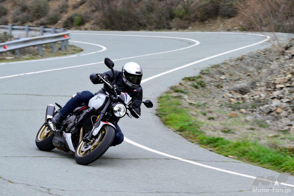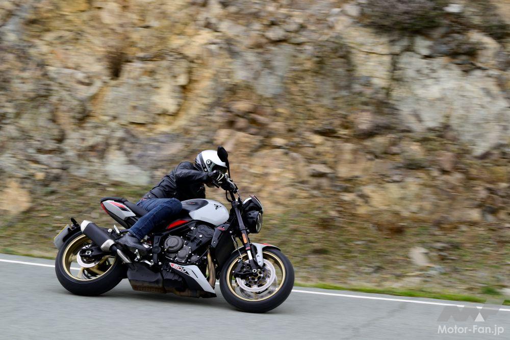ざらっとした独特のウェットな響きが耳に残る、トライアンフ独特の並列3気筒エンジンが目覚める。低回転域からの力感は穏やかで、ライダーを不安にさせるような“怒涛の押し出し”ではなく、芳醇なトルクが滑らかに立ち上がってくる“上品な加速のうねり”が気持ちいい。街乗りからワインディングまで、普通に2速〜4速で事足りるワイドレンジな出力特性が持ち味で、小気味よい吹け上がりと共にワインディングへと突入。4000〜5000rpmあたりからアクセルを開けていくと、トルクの塊とともにサウンドも鼓動からはハイトーンへと変わっていく。単に“速い”ではなく、アクセル開度に素直に反応するレスポンスの良さが魅力。つまり、扱いやすいのだ。スピードトリプル1200のような猛々しさや、ストリートトリプル765の鋭さはないが、それがかえって安心。そして、弟分の660からもう一歩踏み込んだ走りがムリなくできる。