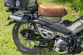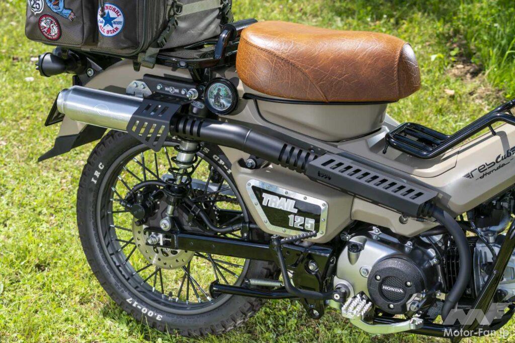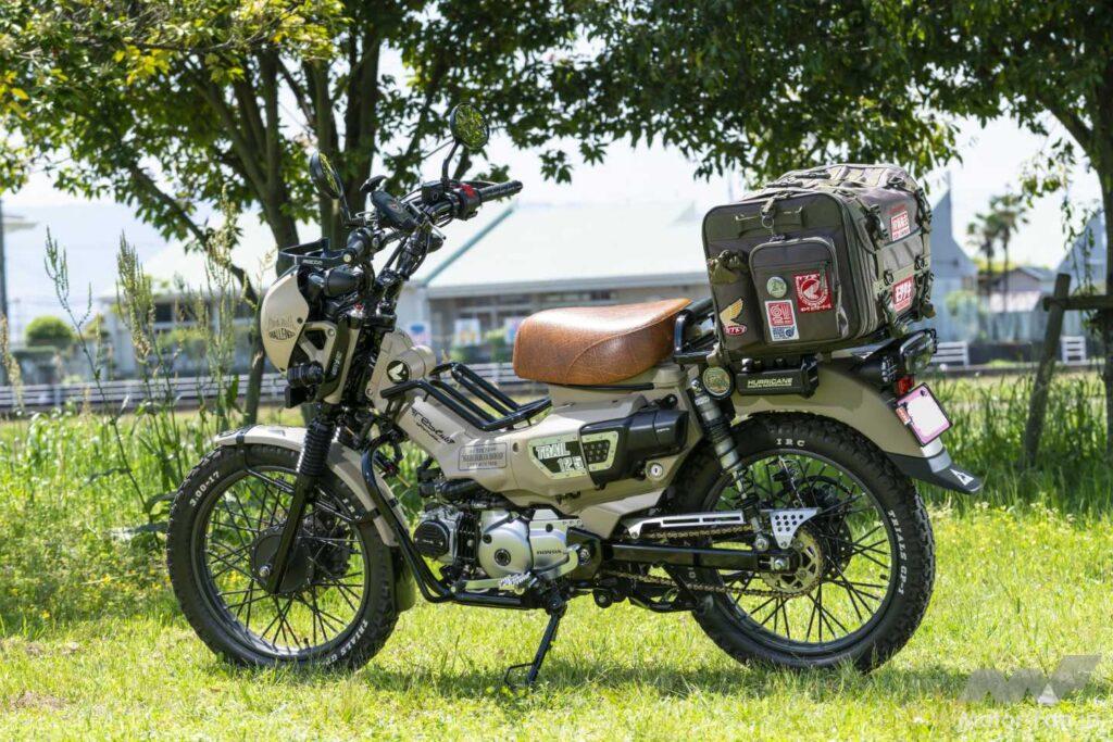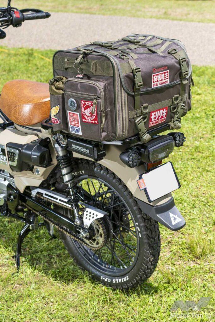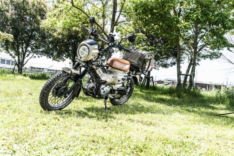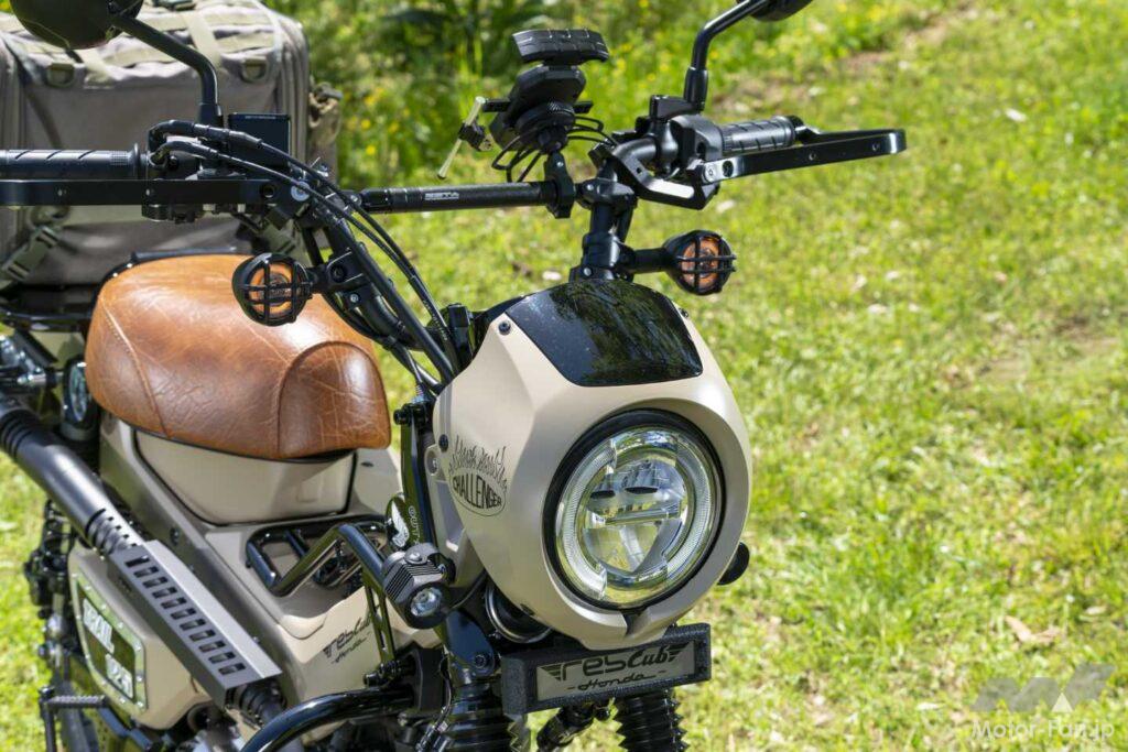 家族のレブルをカスタムした際に外したビキニカウル。その行き場に困り、「ハンターカブに装着できるのでは?」と合わせてみたのが始まりだ。ヘッドライトガードやフロントキャリアが主流の中、レブル純正カウルを流用することで個性的なフロントマスクを実現した。