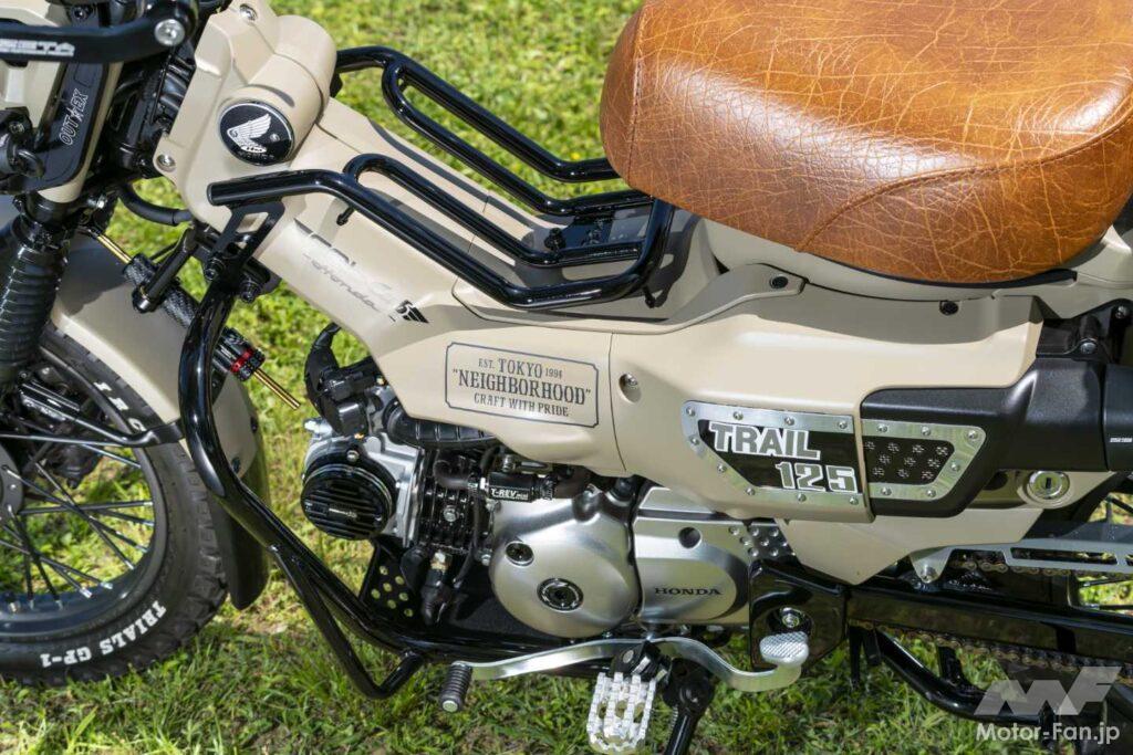 追加パーツはブラックで統一。ツヤありブラックに塗り直す部品もあれば、純正アンダーカバーをチッピングブラックで仕上げるなど、質感の違いを活かした色使いが秀逸だ。オリジナルデカールやアメカジ系ブランドのワッペンも効いている。