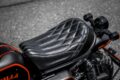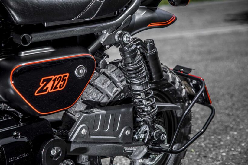 バイクカスタム 「もしゴリラ125があったなら……」そんなイメージを具現化した美しすぎるモンキー125のフルカスタム【写真・3枚目】 黒い外装はすべてオーナーによる全塗装。オレンジのストライプもシートではなくペイント仕上げで、車名や「Z125」デカールもオリジナルデザインだ。 ZETA製ステップでオフテイストを強調。シーソーペダルはダックス125純正を流用するなど、センスの光る組み合わせだ。 タンク別体タイプのリヤショックは通販品からブラックコイルを選択。奥に見えるセンタースタンドはT-REX製。 シートは通販で入手したタイ製で、リヤにモンキーのロゴ入り。ステッチ部のタグをカットし、さり気なくオリジナル感を高めている。 フェンダーレス化に伴いハリケーン製マッドガードを装着。事前にブラックへ塗装し、ナンバー枠はオレンジでアクセントを加える。 この画像の記事を読む