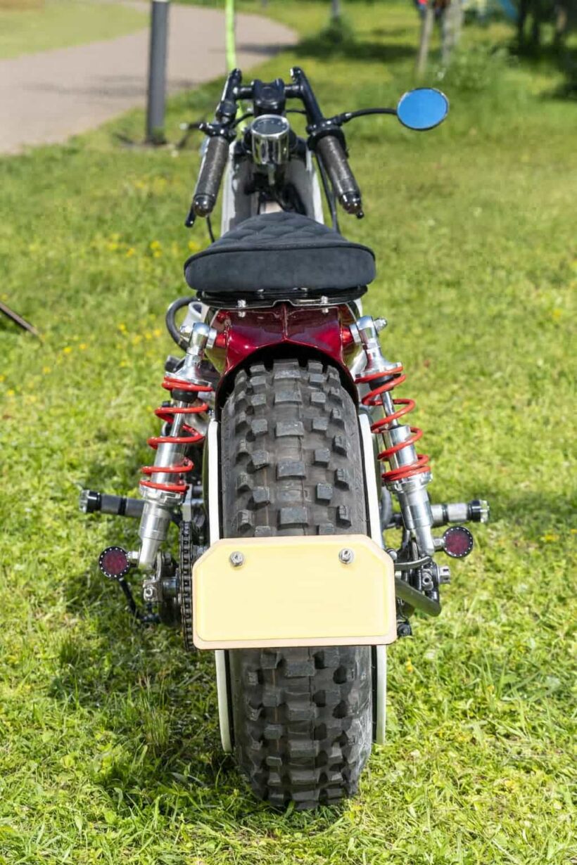 バイクカスタム スーパーカブを軽自動車ライフダンク用タービンでターボ化!バンバン&TWホイールで超太足も実現!【スーパーカブカスタム】【写真・5枚目】 独特な角度のワンオフマフラーはターボ化の副産物。複雑なパイピングの途中にライフダンク用タービンを組み込む。 リヤは90/100-14のオフロードタイヤを引っ張り装着。リヤショックはOKD製、シートはファットムーン製。 フロントリムはバンバン200用、リヤはTW200用ホイールをワイド加工。圧巻の太足化と強烈なローダウンを実現した。 強烈に絞り込んだハンドルはワンオフ加工品。LCDメーターはSP武川製で、スピード&タコをワンボディ化。 88ccエンジンにターボをドッキング。ヨシムラTM24-MJNキャブレターはこれから本格セッティング予定だ。 この画像の記事を読む