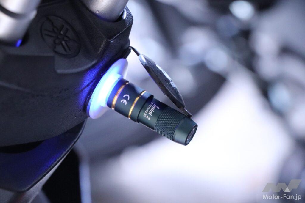 写真は夜間にスクーターのシート下収納部を照らしたモノ。明るさはスマホ以上で、照射範囲も広く使い勝手もバツグン。
