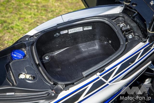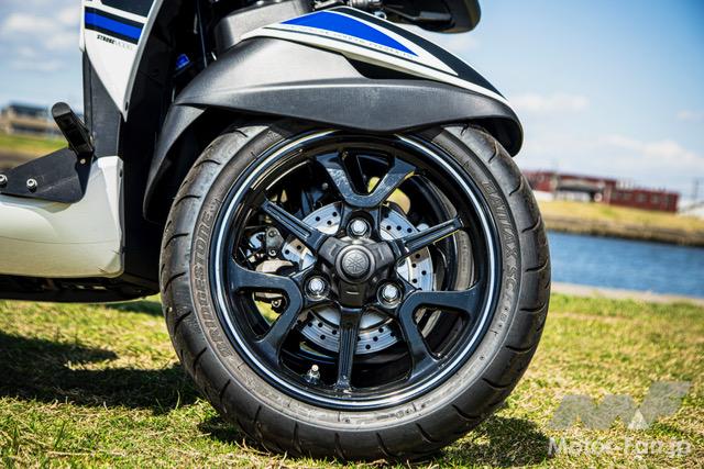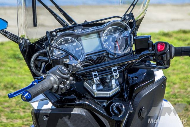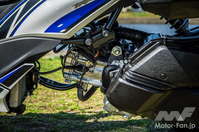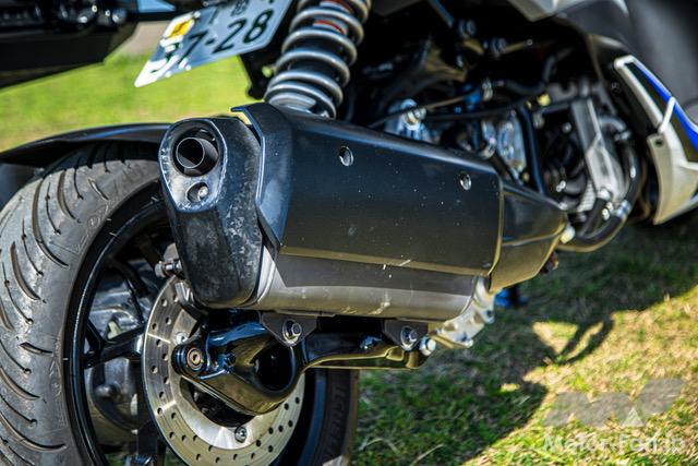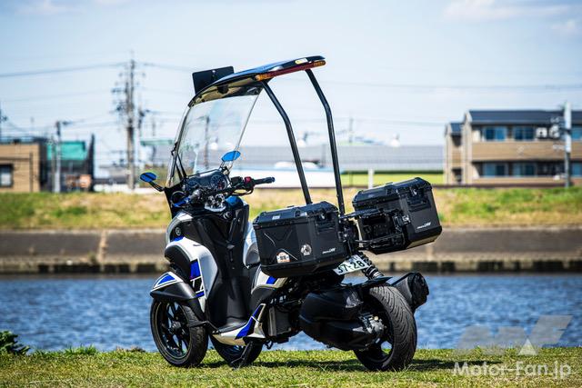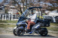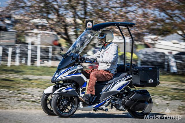 バイクカスタム トリシティ、155ccでも300ccでもなく250cc爆誕!【写真・3枚目】 TEITO製ルーフキットで雨風を凌ぎつつMDF製デカールでドレスアップ! キャリアはミニバイク用を加工流用して延長し、GTR1000用ステーを取り付けてヘプコ&ベッカーのアルミケースを装着。“前足の隙間”には計4個のフォグランプを備えて視認性も格段に高められている。 この画像の記事を読む
