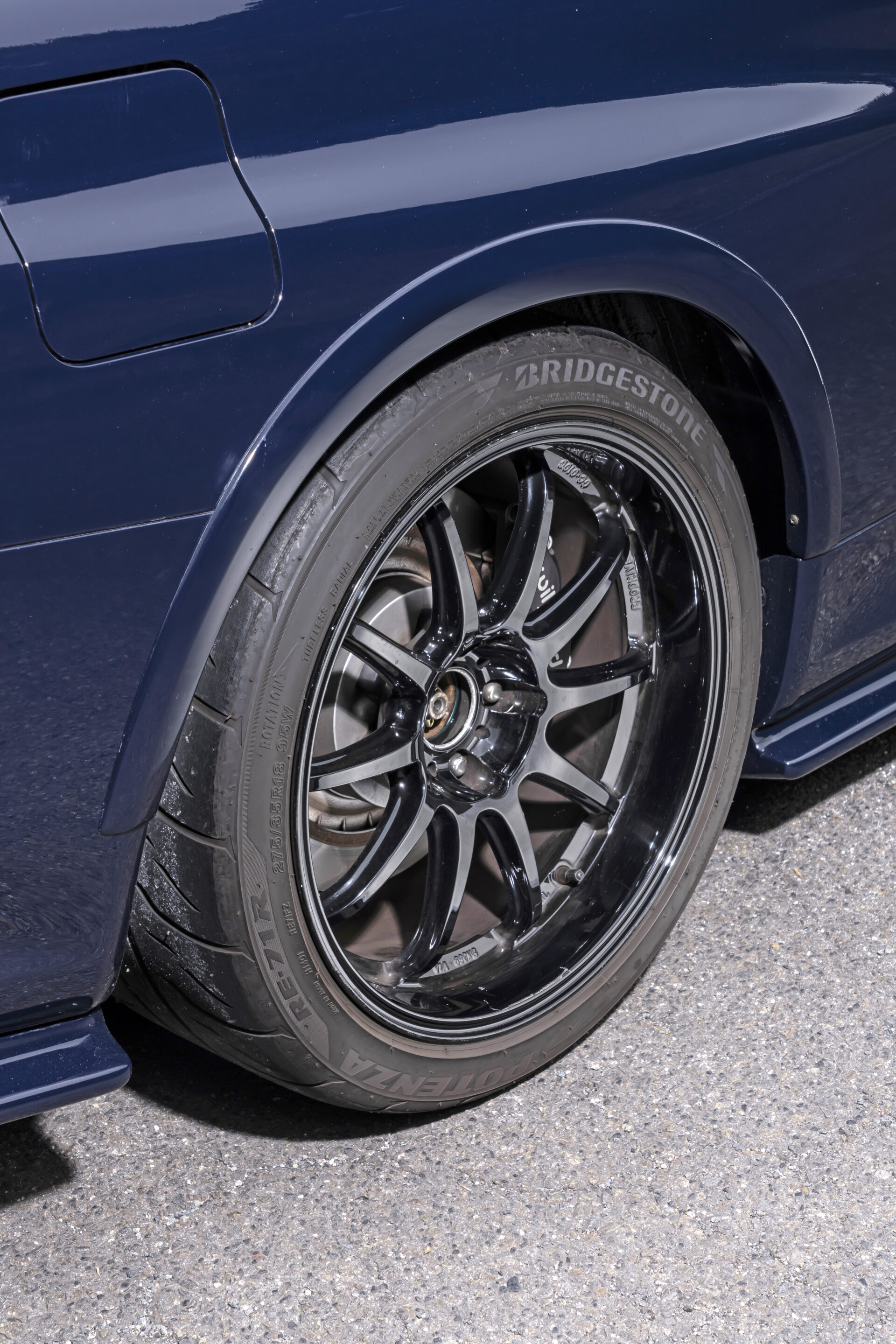フェンダーは前後にニスモのZチューン仕様をチョイス。ホイールはプロドライブのGC−010Gで、タイヤにはポテンザRE−71R(265/35R18)をマッチング。ブレーキはウィルウッドの6ポッドシステムだ。