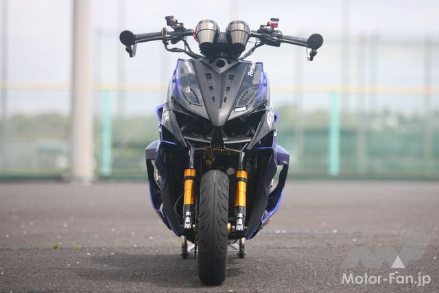 撮影場所でスクーターミーティング以来の再会となったgetabikeさんのグリファスは、サイドアンダーカウルが追加装着されていて、正面から見るとかなりワイドでボリューミーなエクステリアとなっていた。これはYZF-R25前期型の3分割になっているカウルの一部を加工装着しており、グリファスのサイドアンダーカウルとして流用使用すると、サイズ感も造形も絶妙に似合っていて、すでに装着されていたR3用のウイングレットとも相性が良く、他にはない個性を生み出していた。