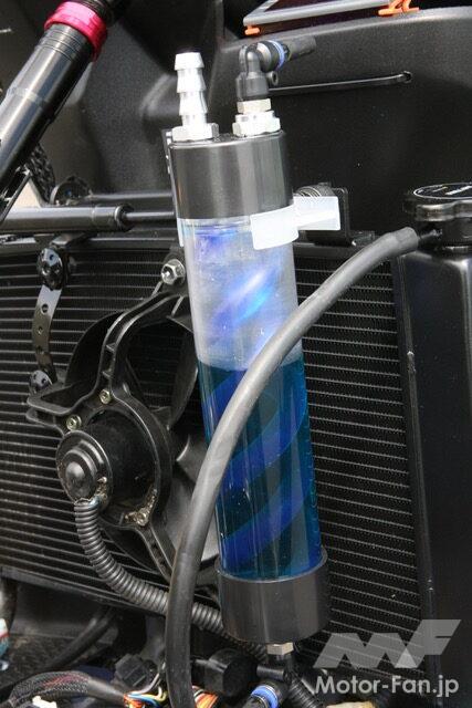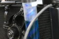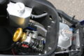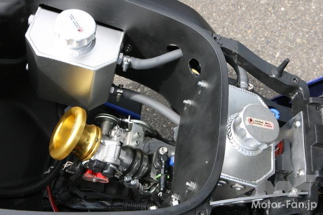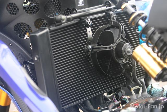 また、スクーターミーティング時にはマジェスティ125用が使用されていたラジエターは、CBR650用の大型のものに変更されており、電動式のウォーターポンプや、決まった水温で自動的にON、OFFする電動ファンも装備。ユニークな外観となる水冷パソコン用のリザーバータンクも盛り込まれており、それらの全てが個性を強調し、アイデアを結集して作られていた。