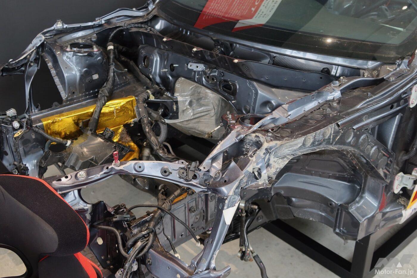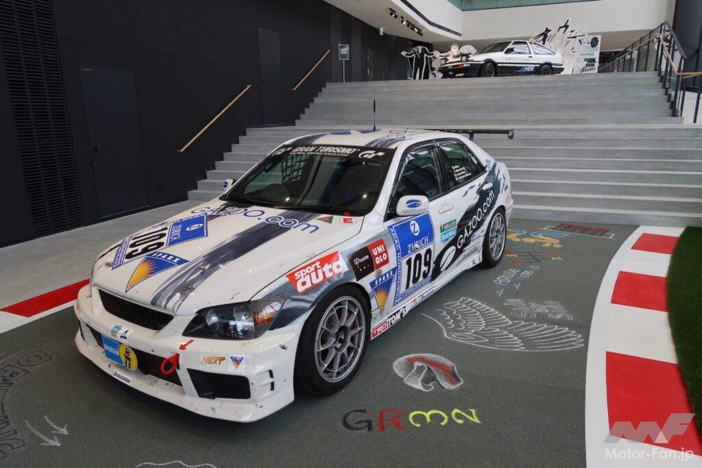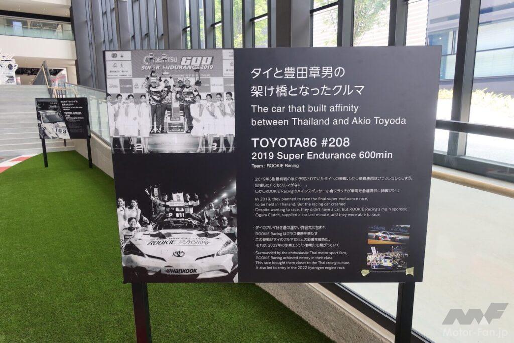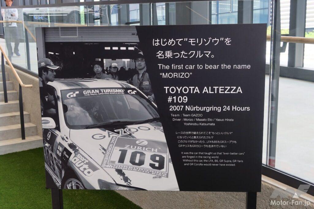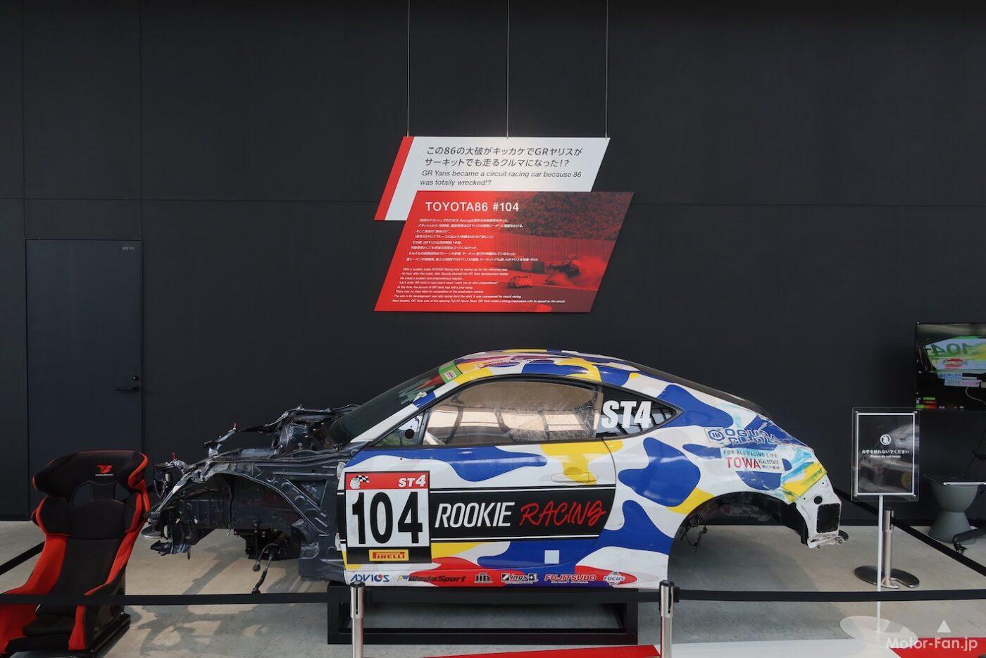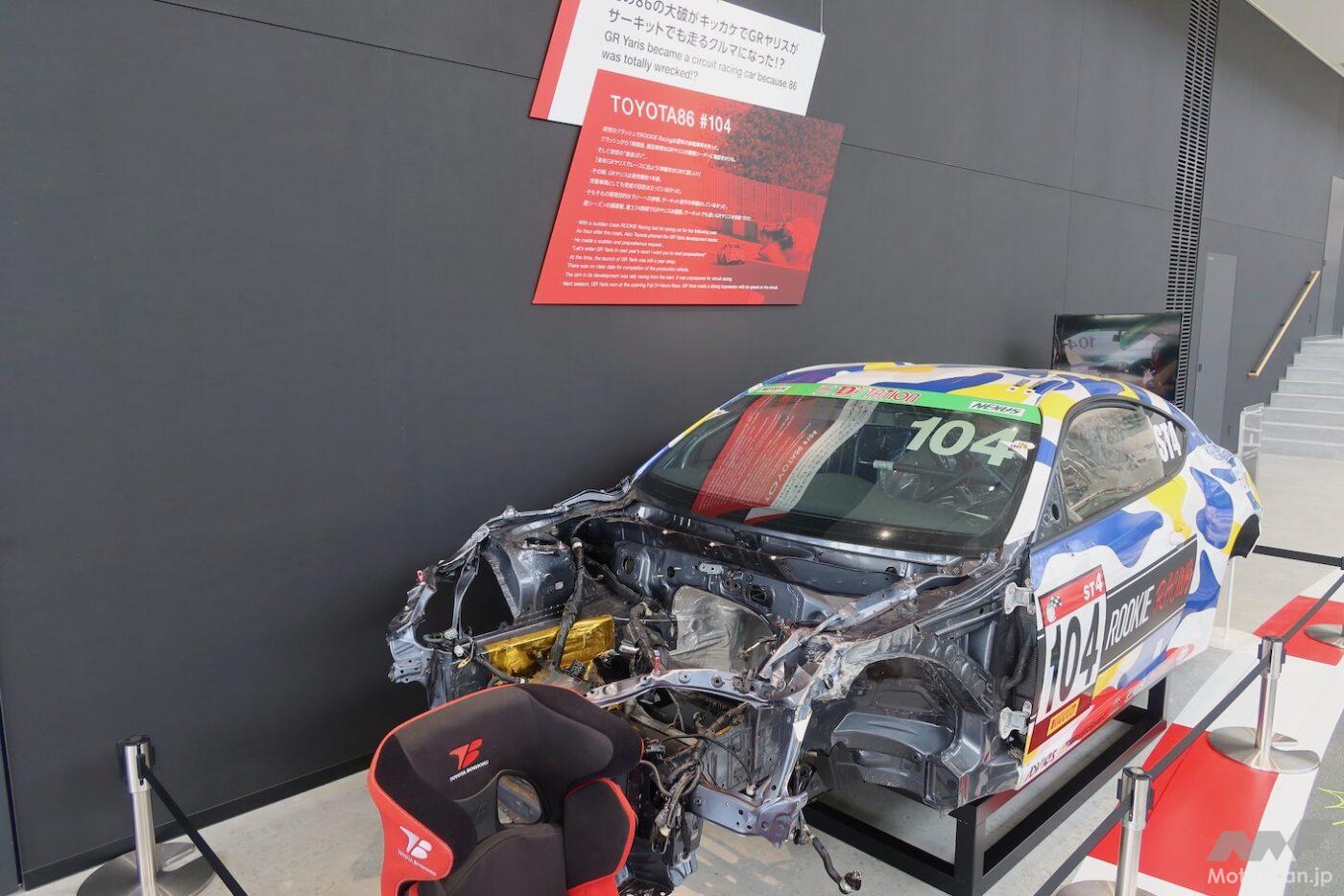 1階は「モータースポーツの“いま”を伝える企画展示コーナー」となっており、グランドオープン時は正面に「タイと豊田章男の架け橋となった」2019年S耐車両のTOYOTA86、GRヤリス誕生のきっかけとなった、「大破した86」、豊田章男氏が初めて「モリゾウ」を名乗った2007年ニュルブルクリンク24時間参戦車両のアルテッツァが、ニュルブルクリンク北コースを模した(?)フロアに展示してある。モリゾウ選手がトヨタのマスタードライバーとなるに至るきっかけとなった出来事を追体験できる仕掛けだ。
