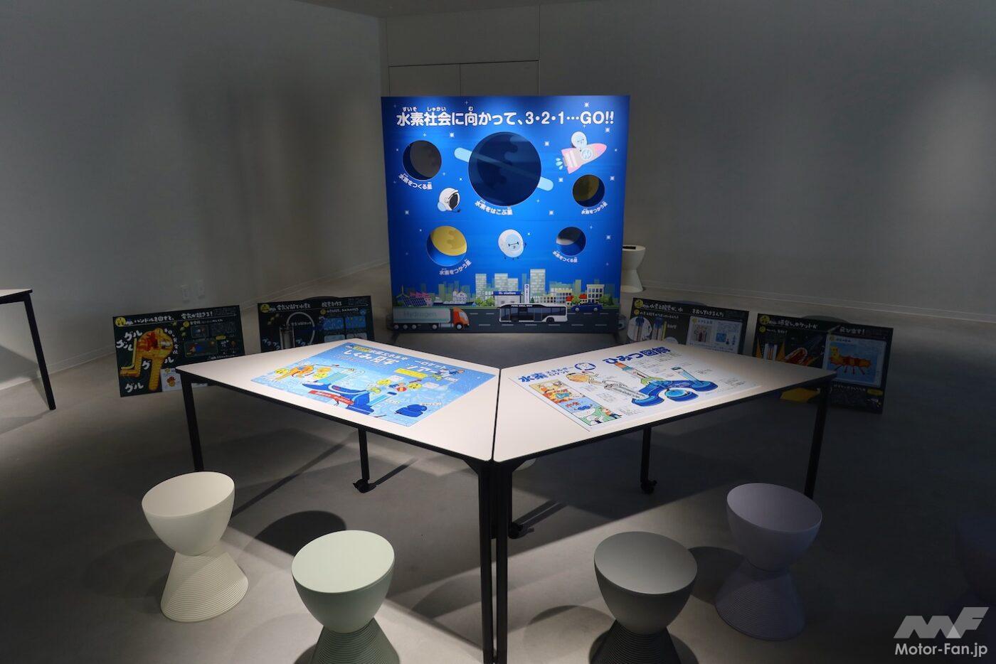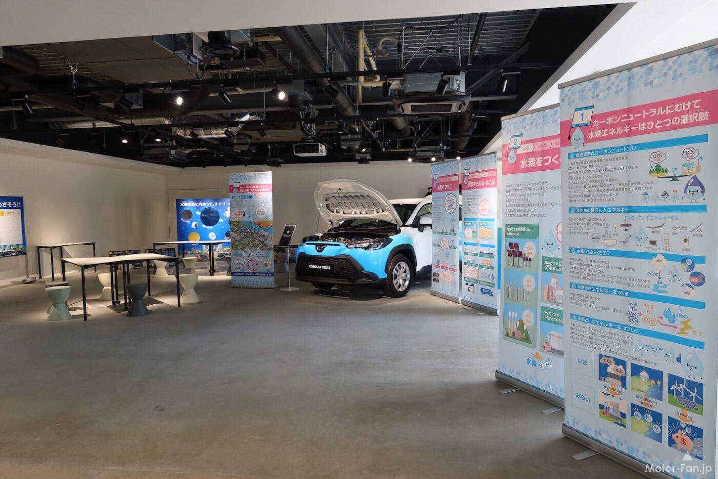 1階の奥には水素エンジンを搭載したヤリス・クロスが展示。水素エネルギーの体験型コンテンツが用意してあり、お子様も楽しめる仕掛けとなっている。