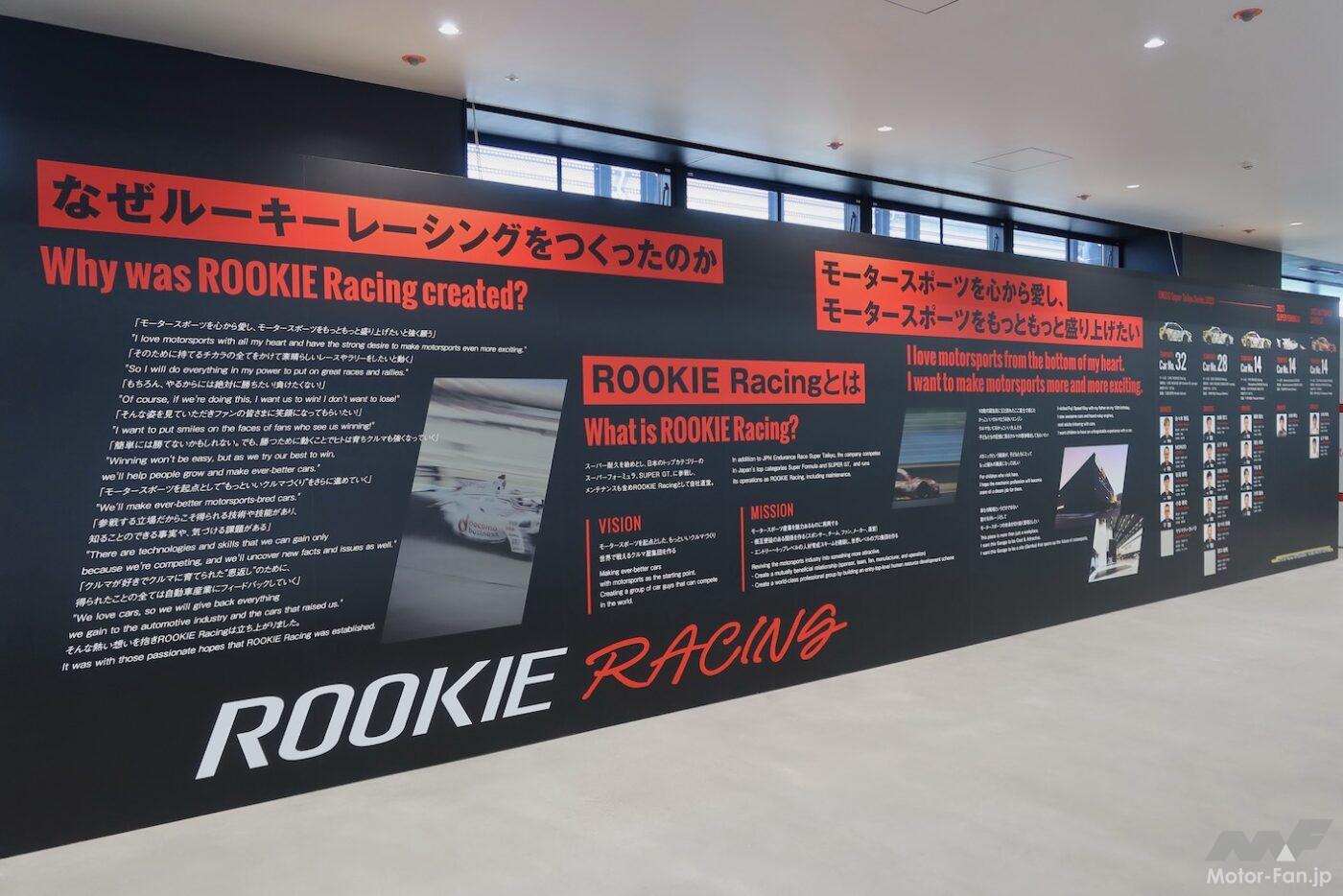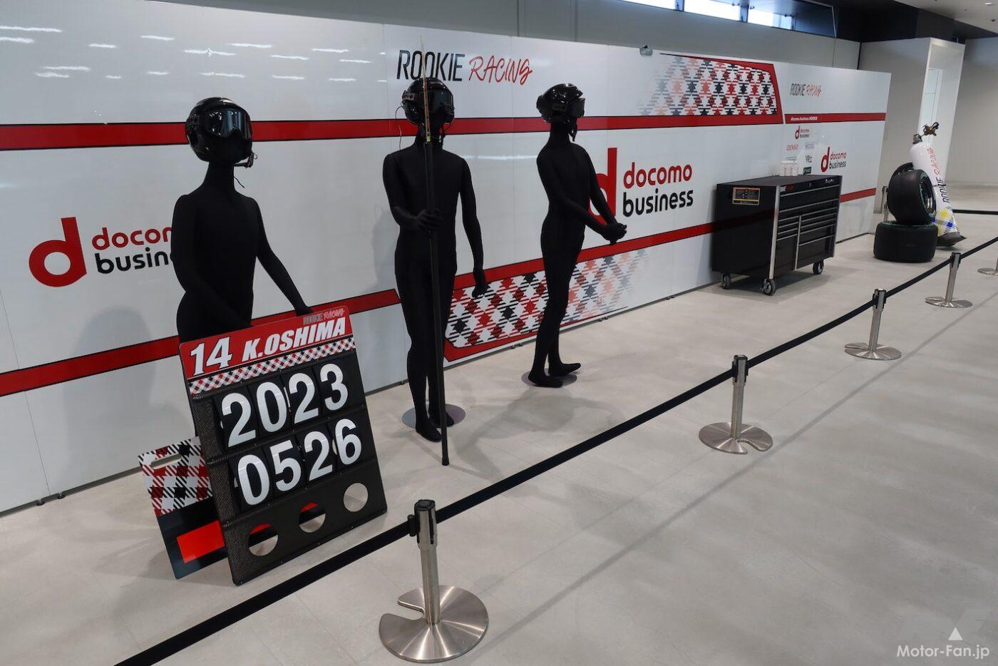 「順路」の案内に従って2階に上がり、渡り廊下を進むと、ルーキーレーシングのワークショップを一望できる見学エリアにたどり着く。どこもかしこも、広い! そして、キレイだ。見学エリアでは整備中の車両や、メカニックが働く様子を見ることができる。モリゾウ選手の思いを伝える壁面のパネル展示も見ごたえあり。どこを切り取っても絵になる空間だ。