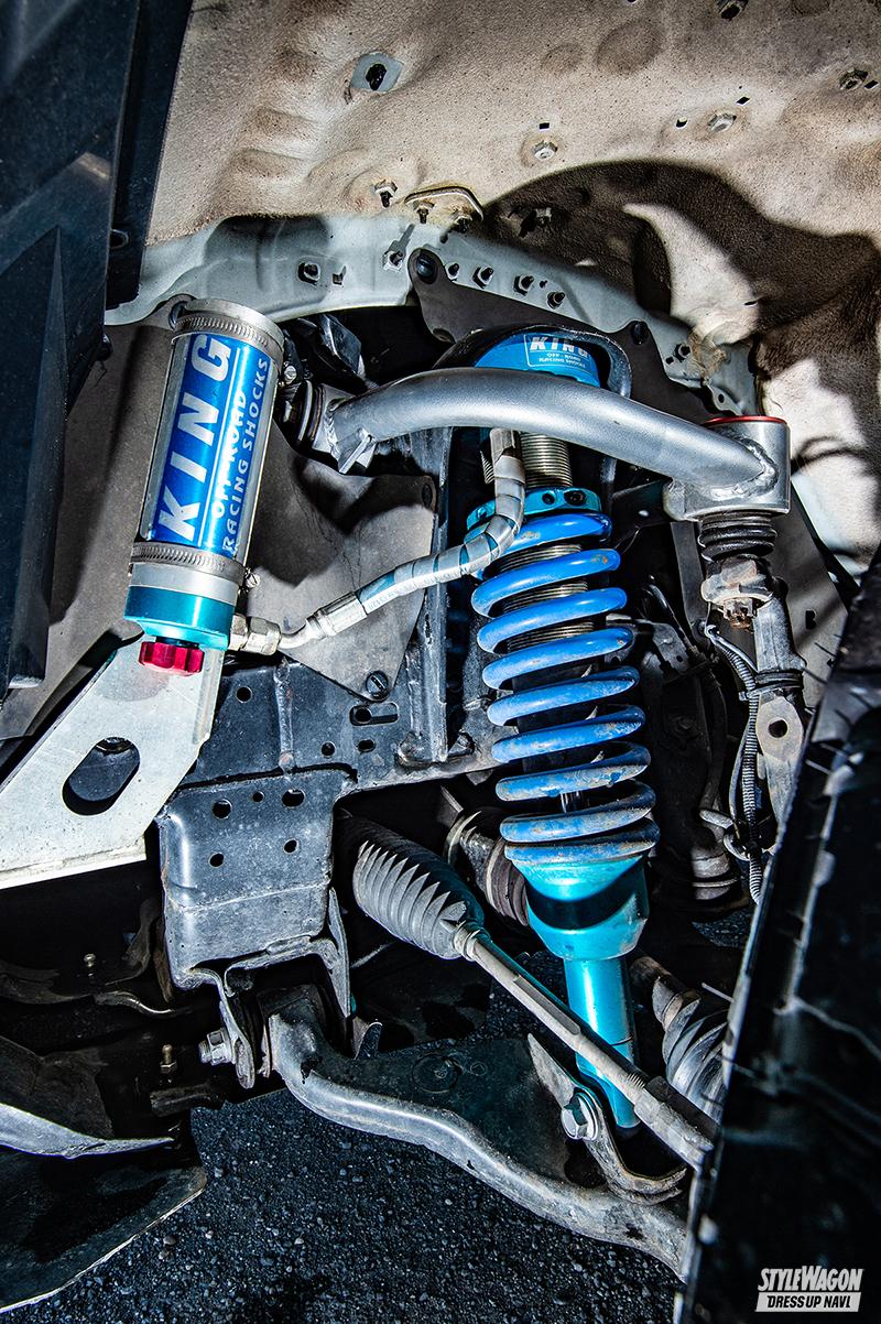 WHEEL/ラグナ・デザートレーサー(16×8.5J-38) TIRE/ヨコハマ・ジオランダーM/T G003(305/75R16) EXTERIOR/フェンダー=パイプ、ヒッチメンバー=ワンオフ、シュノーケル=オーストラリア純正、バグガード=エアプレックス、トノカバー=ラダーフレーム、スキッドプレート=リミテッドチトセ SUSPENSION/サスペンションキット=キング ほかMAKING SHOP/B4L