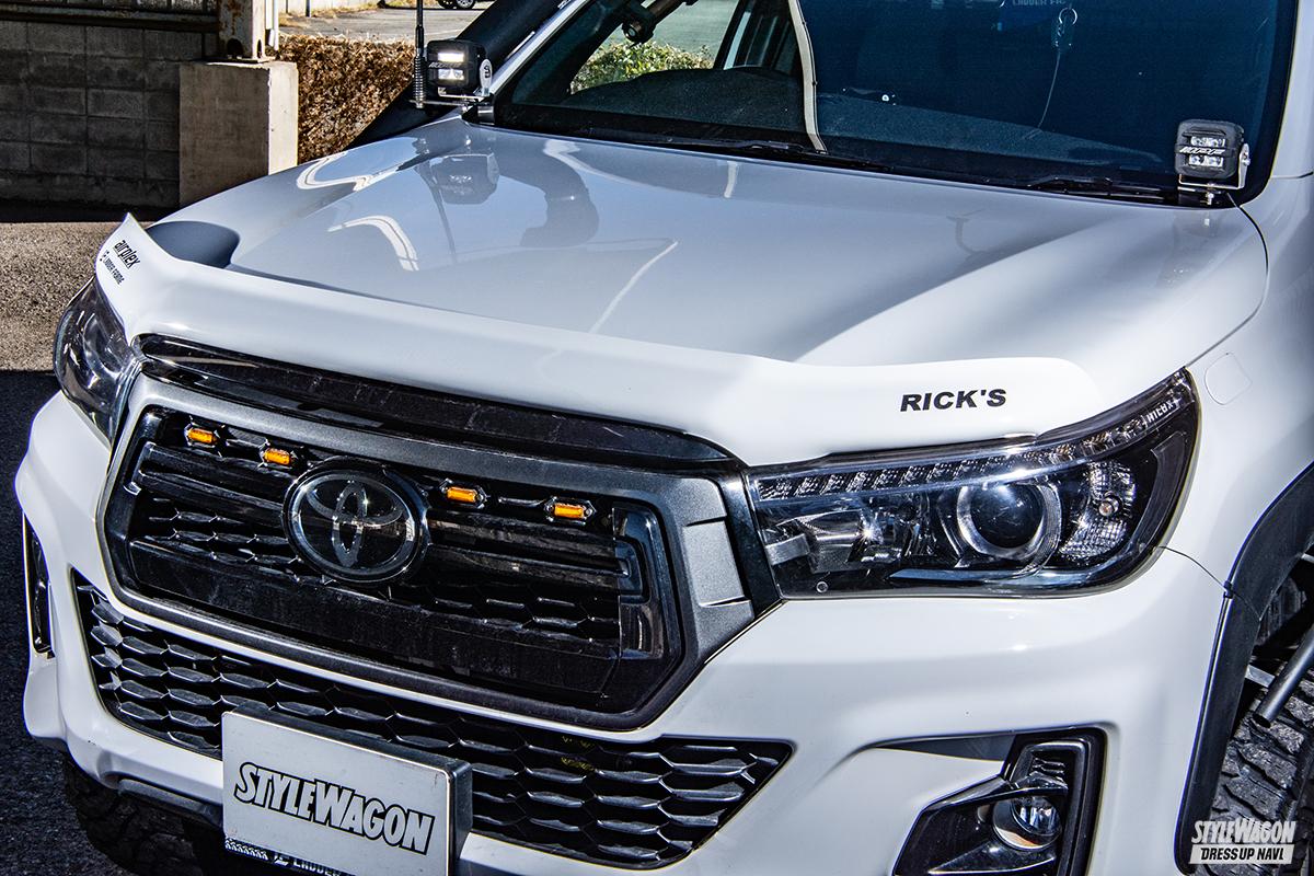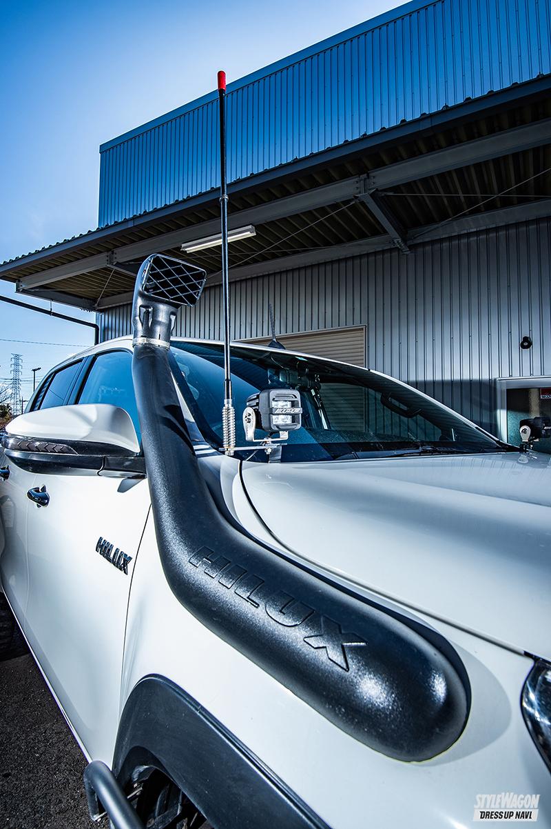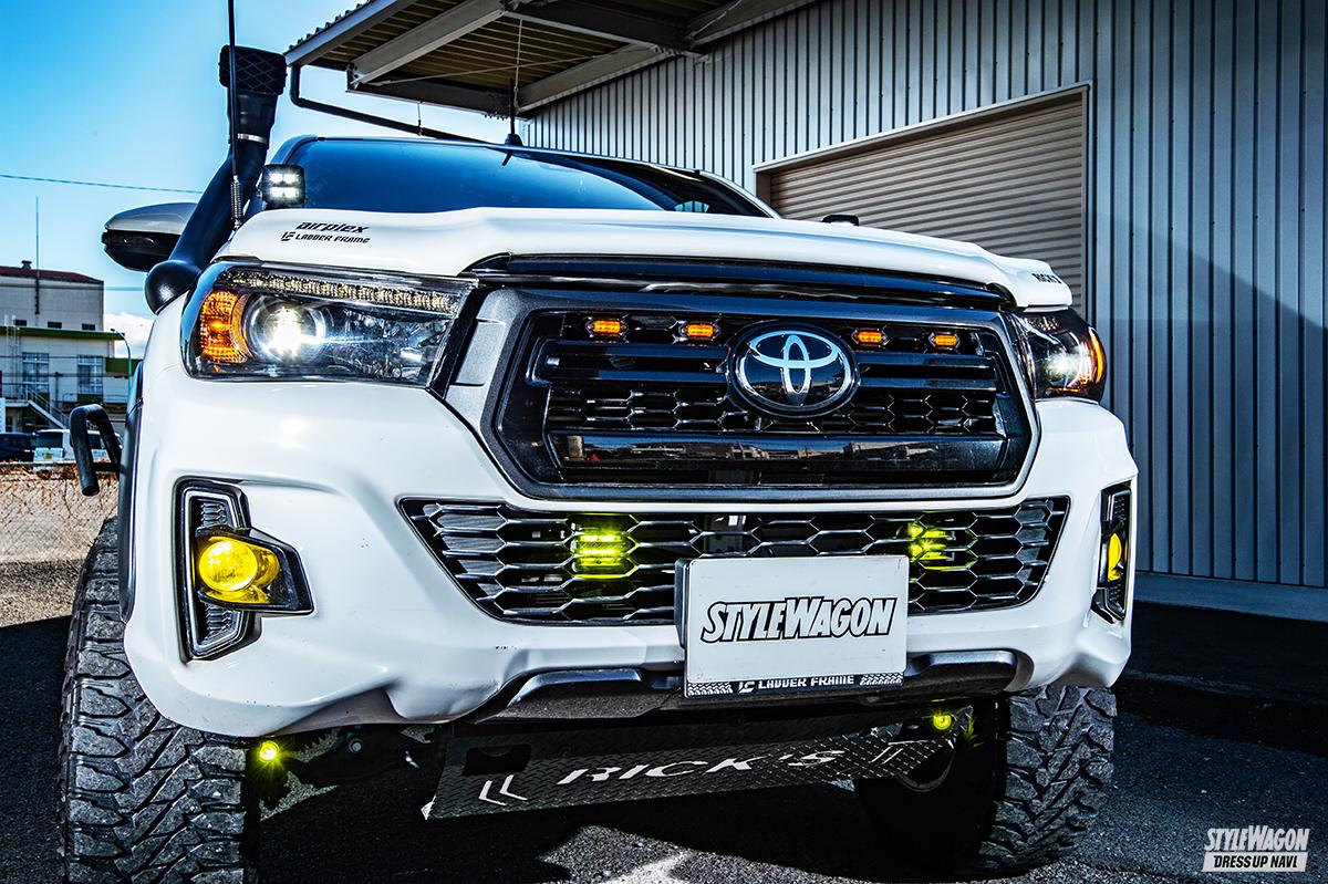 そんな家族のような存在のハイラックスだけに、カスタマイズという名のおめかしは欠かせない。エアロやスキッドプレートをはじめとするエクステリアパーツから、タイヤやホイール、足まわりに至るまで変えていない部分はないのではないかと思わせる陣容となっている。