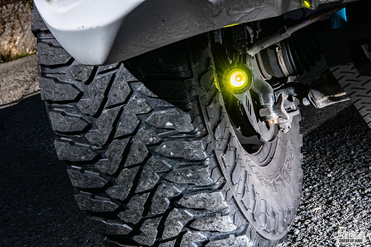 そのなかでもトピックといえるのが、ワンオフのパイプフェンダーとフロント各所のライト。前者はお気に入りのタイヤ・ジオランダーのブロックパターンを見せるべく製作したもので、後者はアウトドアの際の実用性とスタイルアップを兼ねて取り入れた。「人とかぶりたくない性格なので、形だったり色だったり、未知のスタイルを模索しています」。次なる一手も検討中とのことで、どう変わるのか興味は尽きない。