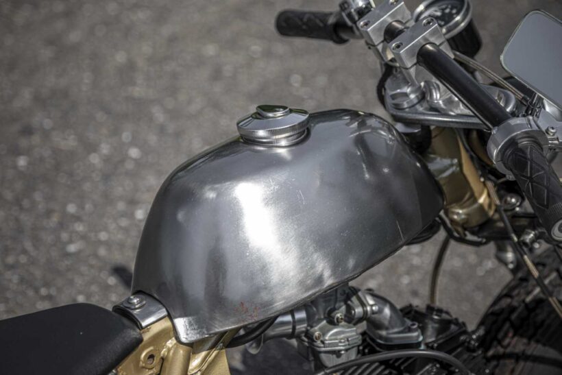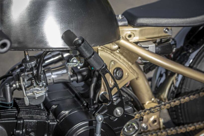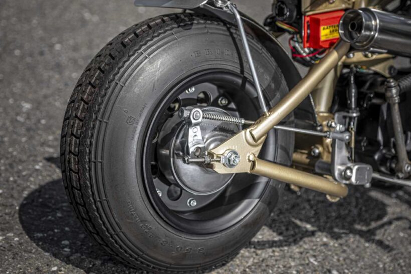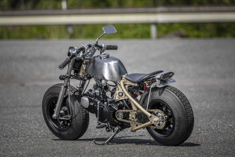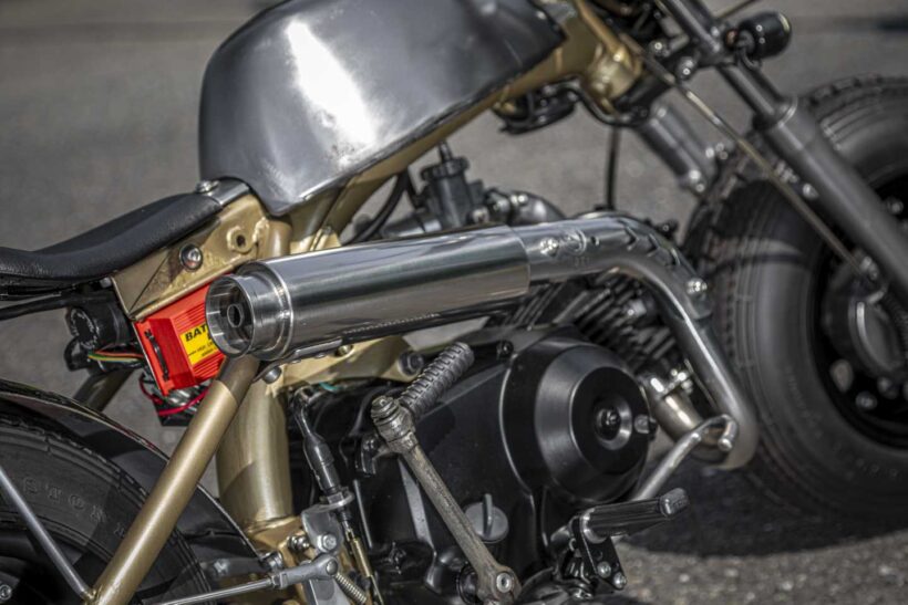 バイクカスタム 小さなモンキーでチョッパーをつくるなら……タイヤ選びは重要!【ビンテージテイスト抜群のモンキーカスタム】【写真・6枚目】 ブラックホイールとブレーキドラムをバフがけし、タイヤを際立たせる。4.75Jホイールに3.50タイヤを組み、引っ張り気味にセット。 ゴールド塗装のフレームとブラック仕様のエンジンが力強いルックスを演出。Z50Aパターンのタイヤは3.50サイズを選択。 アルミステップを加工したステーと連結させ、オリジナルのジョッキーシフトを製作。イグニッション位置にも注目。 サイレンサーのみ市販品を使用したワンオフマフラー。マウントが目立たないよう、サイレンサー下側にステーを溶接。 手叩き風のアルミタンクは4Lイメージの台形デザイン。タンクキャップは純正を使用し、キーを1本化している。 この画像の記事を読む
