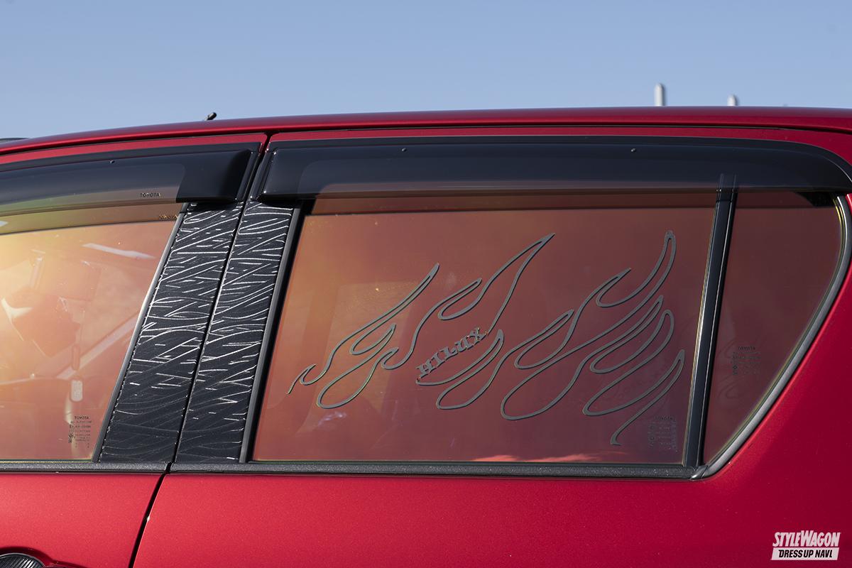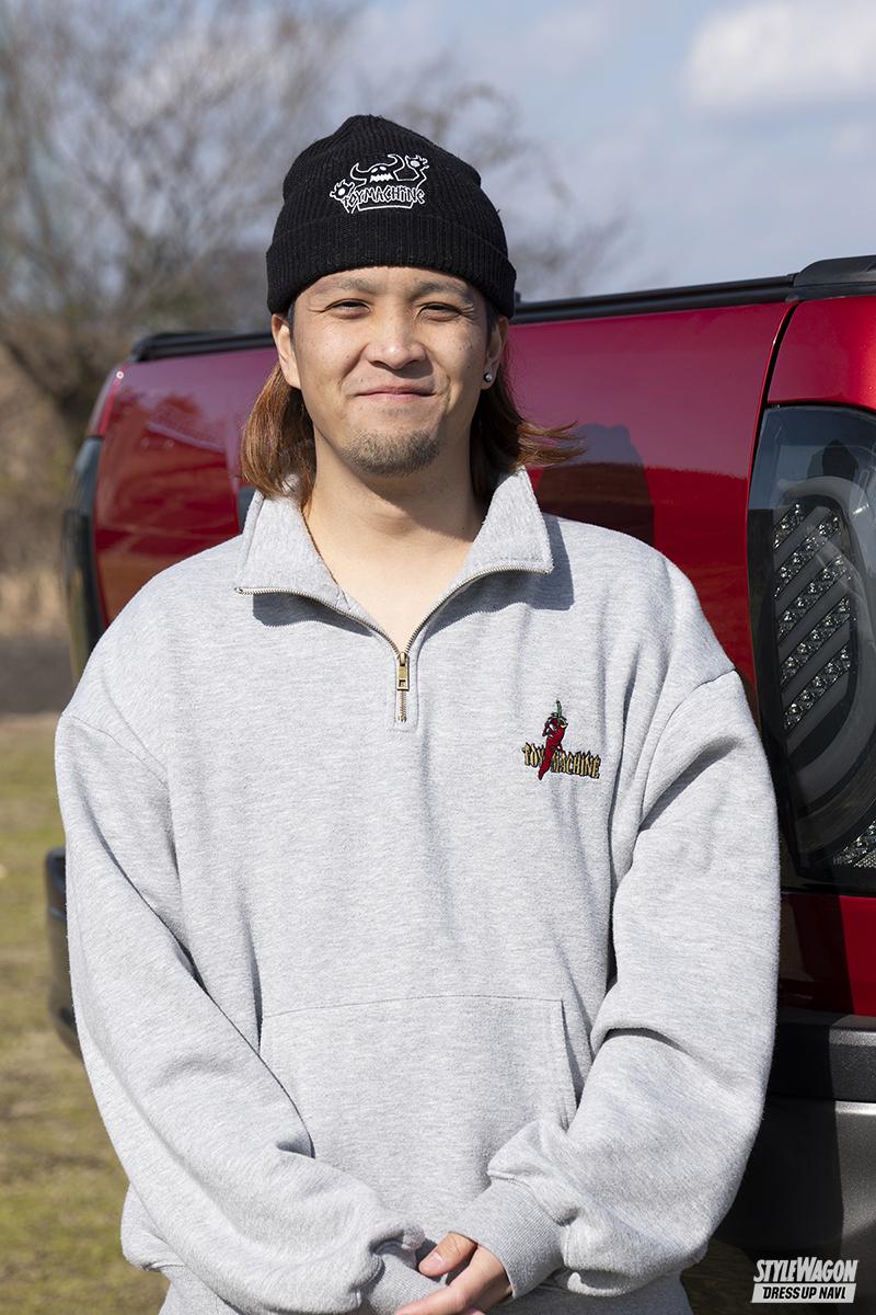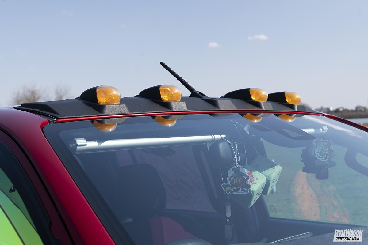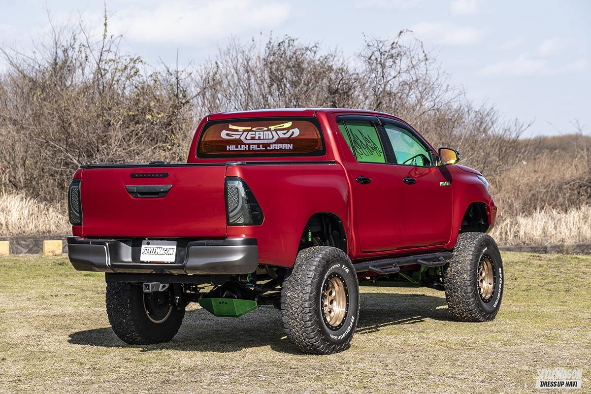 ボディカラーは純正のクリムゾンスパークレッドメタリック。人気が高い色だが、オーナーが好きなグリーンの差し色を取り入れたのが他との大きな違い。この組み合わせは珍しいが、意外にも違和感なくハマッているから面白い。下まわりやゴーストフィルムといった目立つ部分はもちろん、普段はトノカバーで見えない荷台部分にもグリーンをあしらって遊び心をアピールする。しかしそれ以外のカスタマイズは割とシンプル。ルーフラックやバンパーガードなどのパーツでゴテゴテ飾らず、TODAのフロントバンパーや社外のサイドステップと少ない手数で変化を付けている。