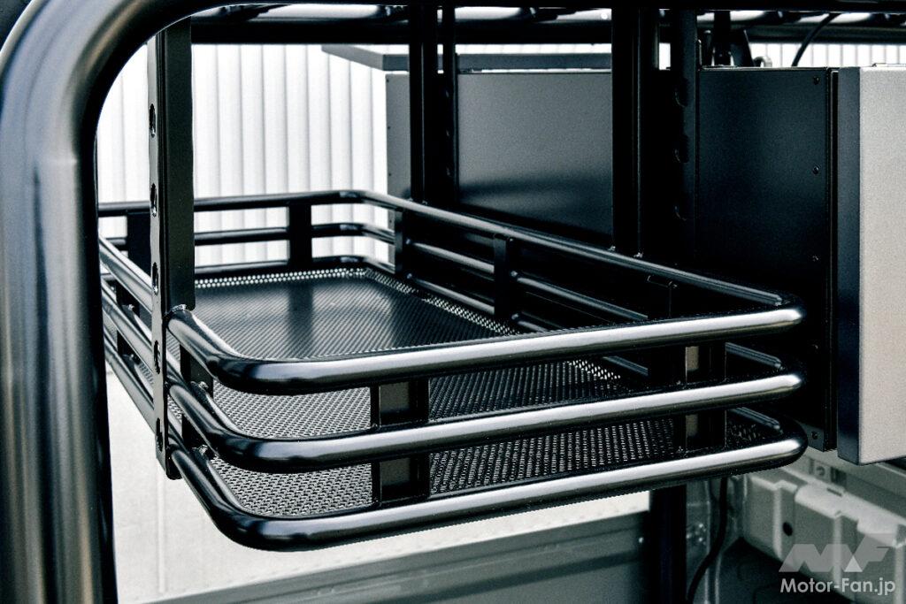 昭和30年から続く精密板金加工技術を生かし、軽トラ用のカスタマイズパーツを開発。注目は極太のパイプを絶妙に曲げ加工して作られたルーフラック。メインとなるパイプは荷台フロアの四隅に固定する手法で、極力積載スペースを犠牲にしないように設計。上部は縦に長く、ここに脚立などの長尺物を固定できる。そしてこのルーフラックはキャリアやラダーなどオプションパーツが充実しており、用途に合わせて自由にアレンジできる。