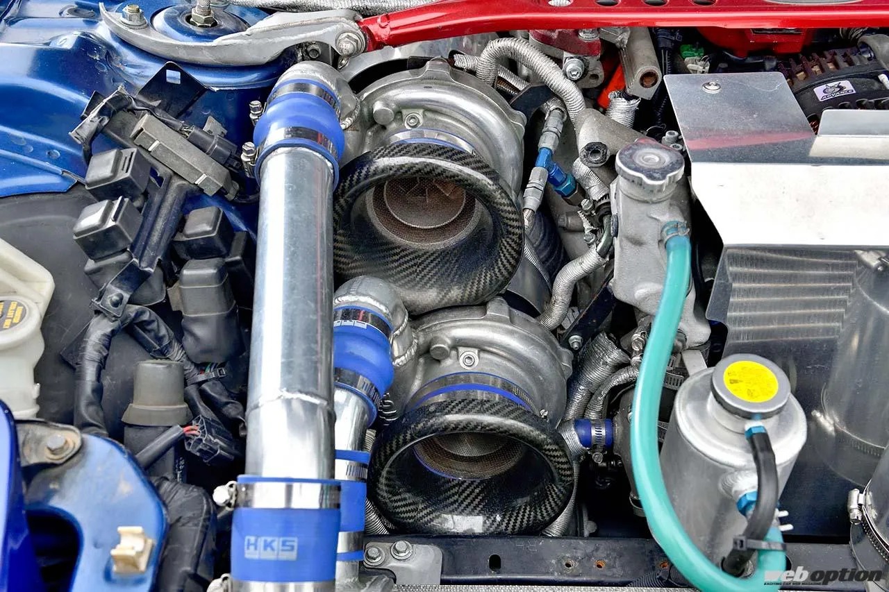 “究極のストリートスペック”をテーマに仕上げられたFD3S。エンジンは、GTX3076Rタービンを左右に1基ずつ配置したブリッジポート仕様だ。インテークポートが横に長い13Bコスモ用のハウジングを使い、ローブーストでも強烈なパワーを狙う構成。サージタンクも13B用で、HKS製インタークーラーと1000ccインジェクターを組み合わせることで、最大ブースト圧1.1キロ時には550psを発生する。