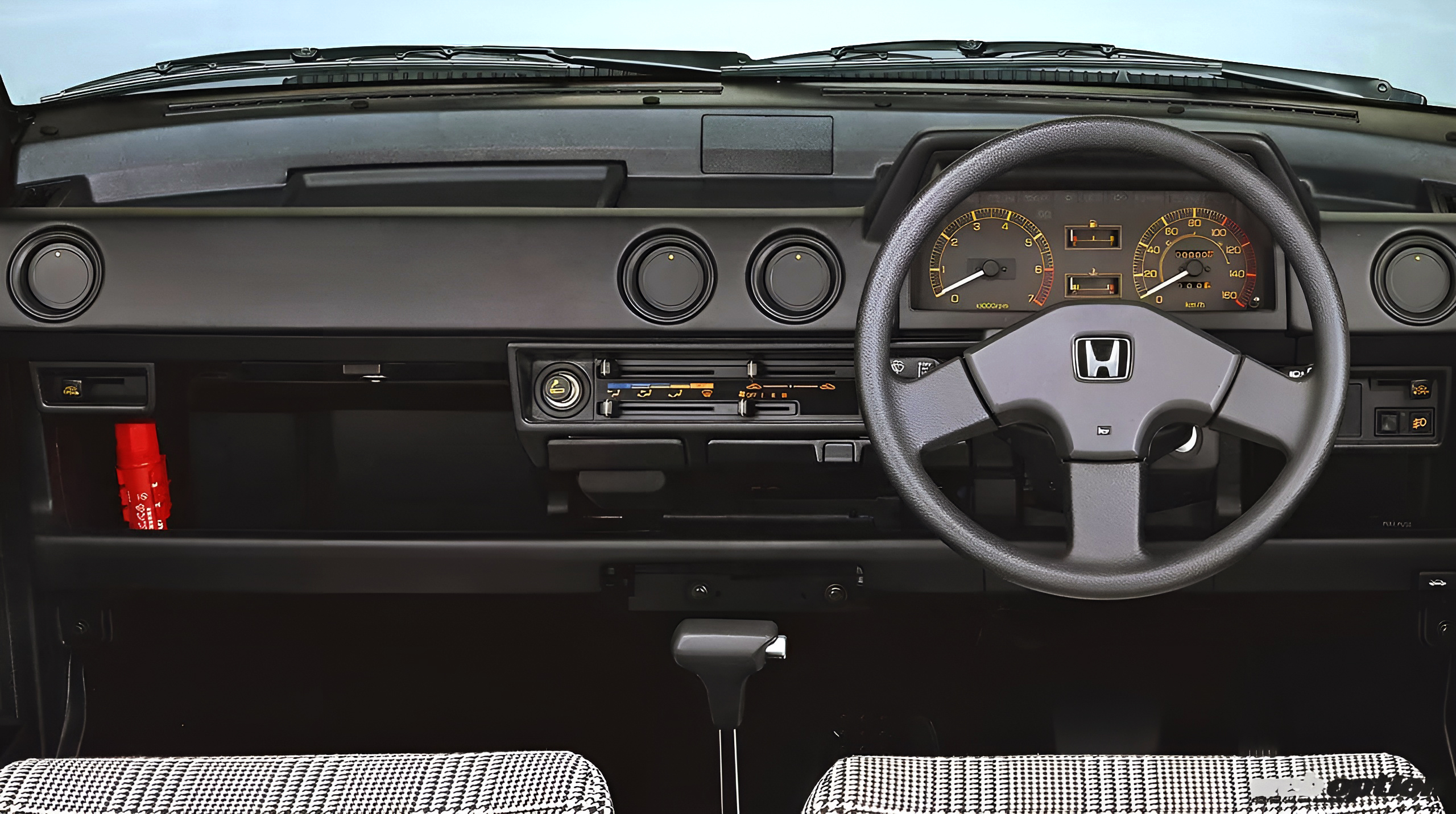 ミッションには5速MTと、ホンダマチックと呼ばれる3速ATを用意。3速ATはODレンジでトルクコンバーターのスリップを防ぐロックアップ機構が付く。P-R-N-OD-★-Lの6ポジションで、ギヤ比はLが1.782、★が1.206、ODが0.828。車重は素のシティより100kg以上増えて800~810kgに達したが、オープンエアドライブを楽しめるのだから、そこに文句を言っても仕方がない。