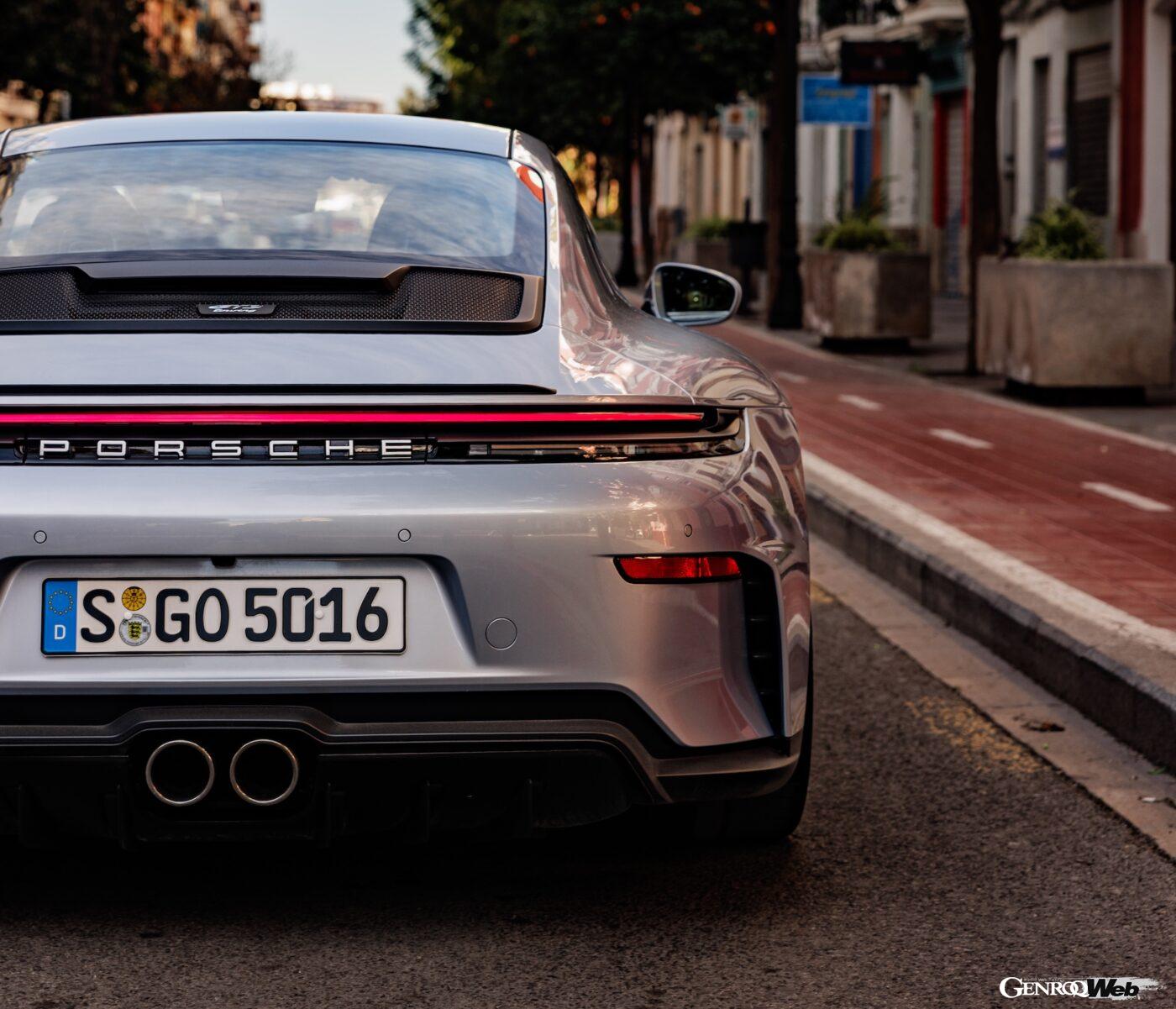 まずシャシーは、タイプ992で初めてダブルウイッシュボーン式とされたフロントサスペンションのアームの取付点がずらされ、アンチダイブジオメトリーとされた。減速時にフロントが沈み込んだ時のオーバーステア傾向を補正するのが狙いだ。