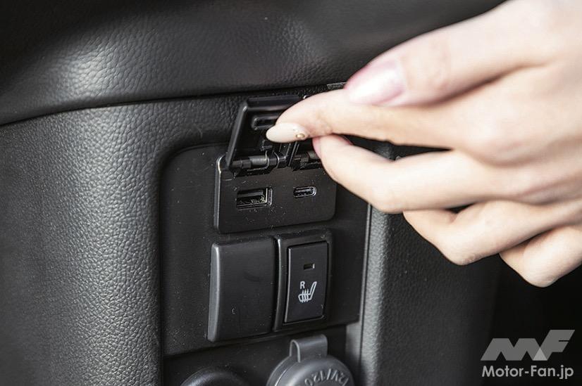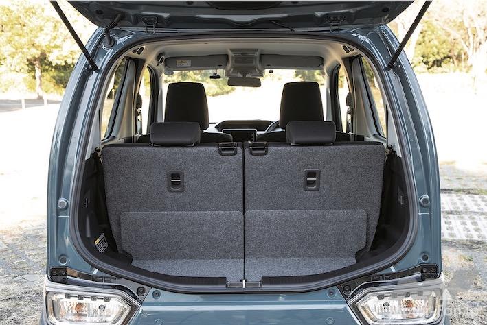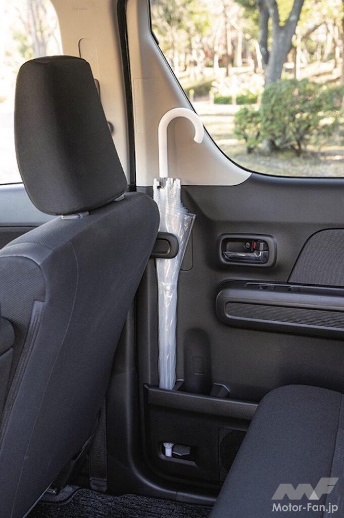 室内の使い勝手が良いのも、ワゴンRの魅力。後席が左右独立してスライドできるのは他車同様だが、ワゴンRは助手席の背もたれが前側にフラットに倒せるから、2mを超える長い荷物を積んでも2名が乗れる。助手席のクッションを引き起こすと、四角いバケツが入っている。ここに運転専用の靴を入れておけば、お気に入りのサンダルやハイヒールから履き替えて安全に運転できる。後席ドアには傘立ても付いており、濡れた傘の置き場所に悩む必要もない。