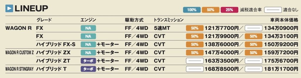 外観デザインを複数用意するのは軽ハイトワゴンの常套手段だが、ワゴンRは他社よりひとつ多い3種類。昨年までは、標準車とそのプレミアム版の「FZ」、アメリカンテイストの〝スティングレー〞という3系統だったが、マイナーチェンジで「FZ」を〝カスタムZ〞として独立モデル化。スティングレーにしか設定のなかったターボエンジン搭載車も用意するなど、選択肢を広げた。