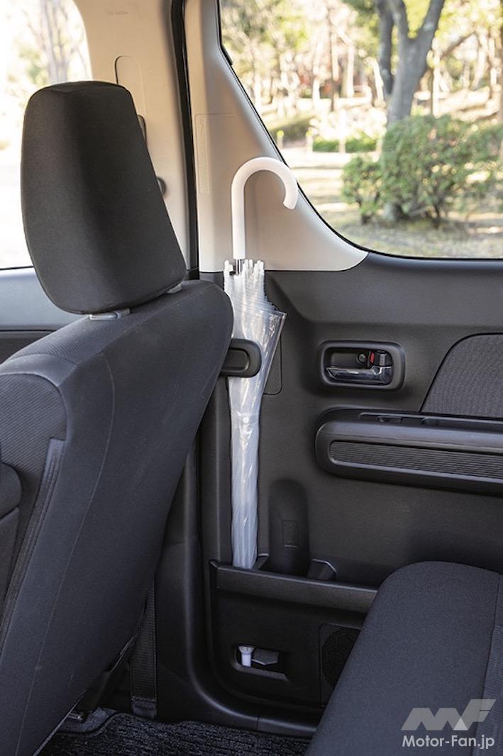 室内の使い勝手が良いのも、ワゴンRの魅力。後席が左右独立してスライドできるのは他車同様だが、ワゴンRは助手席の背もたれが前側にフラットに倒せるから、2mを超える長い荷物を積んでも2名が乗れる。助手席のクッションを引き起こすと、四角いバケツが入っている。ここに運転専用の靴を入れておけば、お気に入りのサンダルやハイヒールから履き替えて安全に運転できる。後席ドアには傘立ても付いており、濡れた傘の置き場所に悩む必要もない。