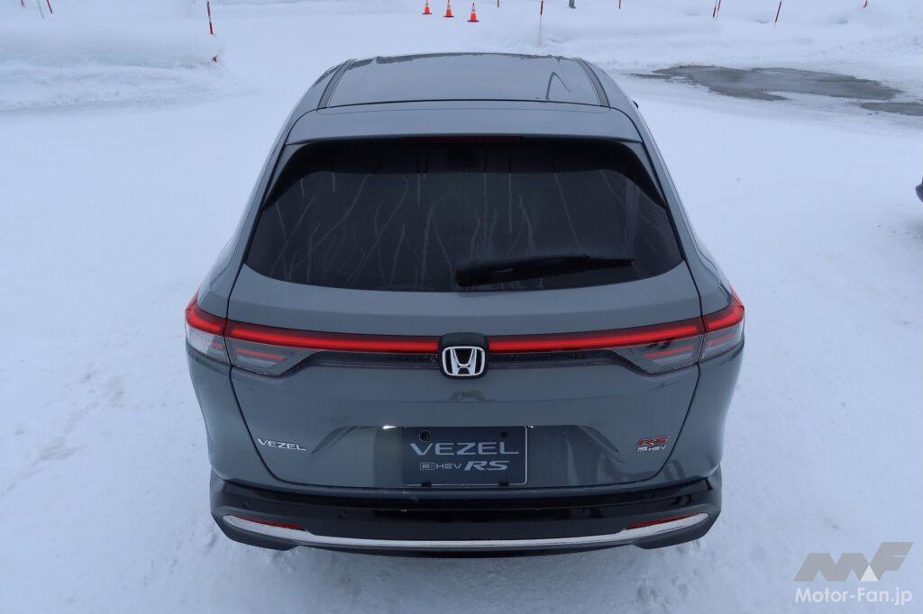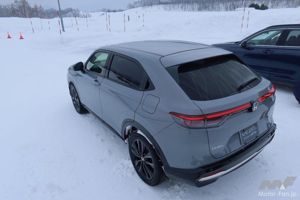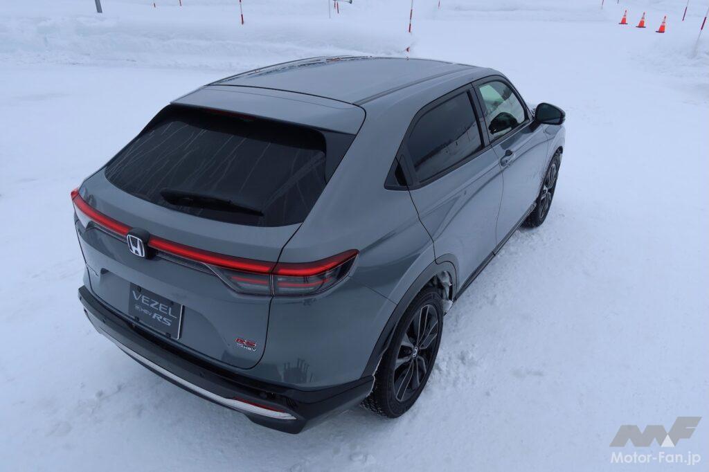 雪上コースではヴェゼルe:HEV RS 4WD(1460kg)に加え、ZR-V e:HEV Z BLACK STYLE 4WD(1630kg)、CR-V e:HEV RS 4WD(1800kg)を試すことができたのだが、ヴェゼルの軽快感が印象に残った。質量の小ささがもたらす身のこなしの軽さは何ものにも代えがたい。元気に走っているときに車室内に透過し、耳に届くスポーティなエンジンサウンドは高揚感を増幅させる効果があると感じた(ZR-VとCR-Vは2.0Lエンジンを搭載)。