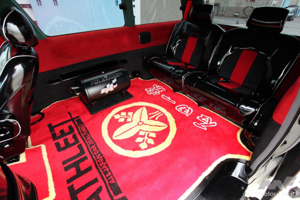 そしてもうひとつ、このクルマの個性を強く印象づけているのがインテリアだ。外装はシックなカラーリングでまとめられているのに対し、車内は赤と黒を基調とした硬派なコーディネート。大胆な配色で仕立てられたインテリアは、ドアを開けた瞬間に思わず目を引く仕上がりになっている。
