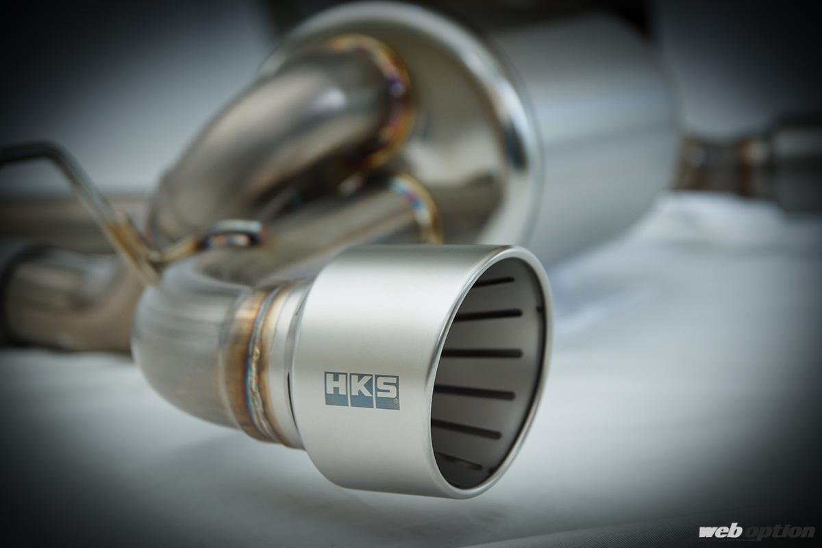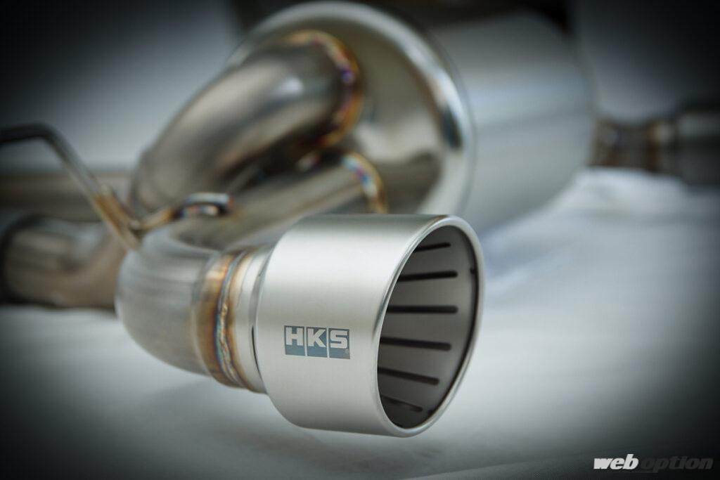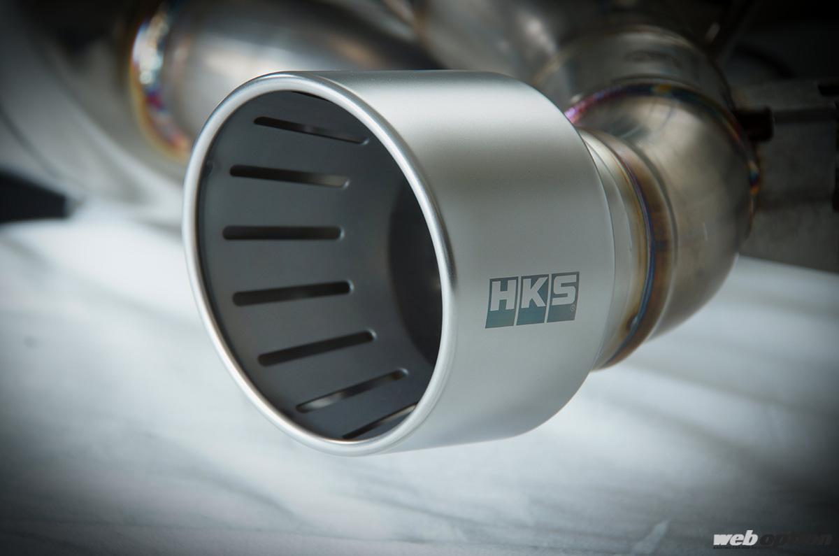 純正マフラーは中間部にサイレンサーを備えているが、HKSのスーパーターボマフラーはこれをキャンセル。車検対応でありながら、中高音域でパンチ溢れるサウンドを叶えてくれる。