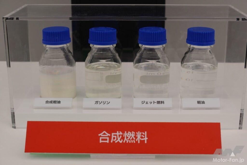合成燃料走行デモンストレーション式典にはENEOSが国内で製造した合成燃料が持ち込まれた。まず、プラントで合成粗油をつくり、沸点の違いを利用して成分を分離させ、ガソリン、ジェット燃料、軽油など、目的別に石油製品を得る。合成燃料のガソリンは化学的には通常のガソリンとまったく同じなため、通常のガソリンと同じように使うことができる。