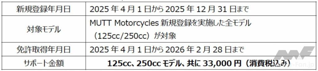 MUTT Motorcyclesの日本正規代理店であるピーシーアイ株式会社は、2025年4月1日から12月31日までの期間に新車を購入し、同年4月1日から2026年2月28日までに普通自動二輪小型限定免許(MT)または普通自動二輪免許(MT)を取得した顧客を対象に、免許取得費用として33,000円(税込)をサポートするキャンペーンを実施する。このキャンペーンは、他のキャンペーンとの併用も可能で、MUTT Motorcyclesの全新車モデルが対象となる。