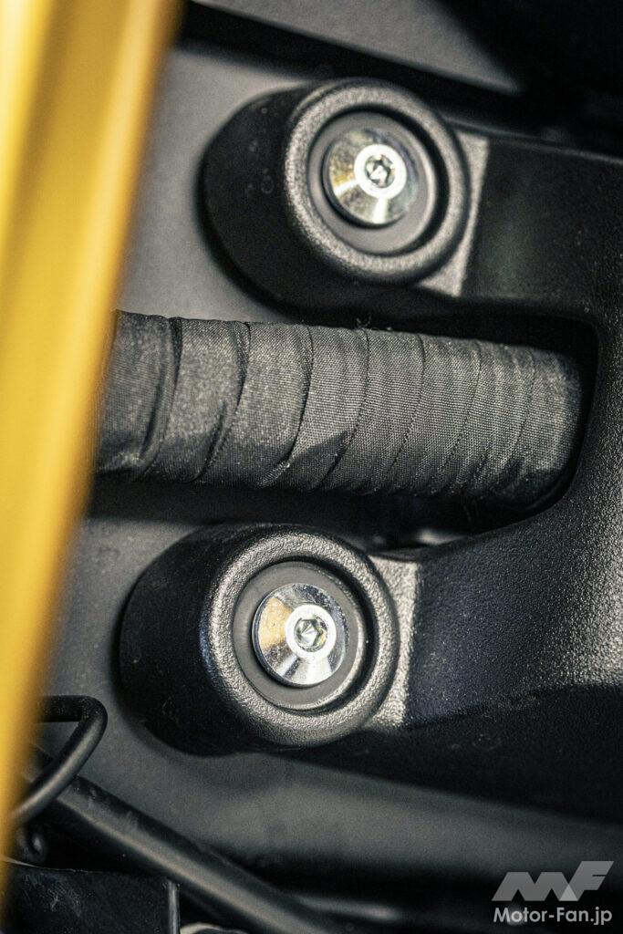 「カタチはどうにでもできるけど、付ける場所が難しい」と木下さん。フレームに設けられた配線隠しのカバー取り付けボルト穴と、エンジン前方にある穴をうまく使えばスッキリ装着できそう。万一転倒した際の応力の掛かり方も考慮したい。