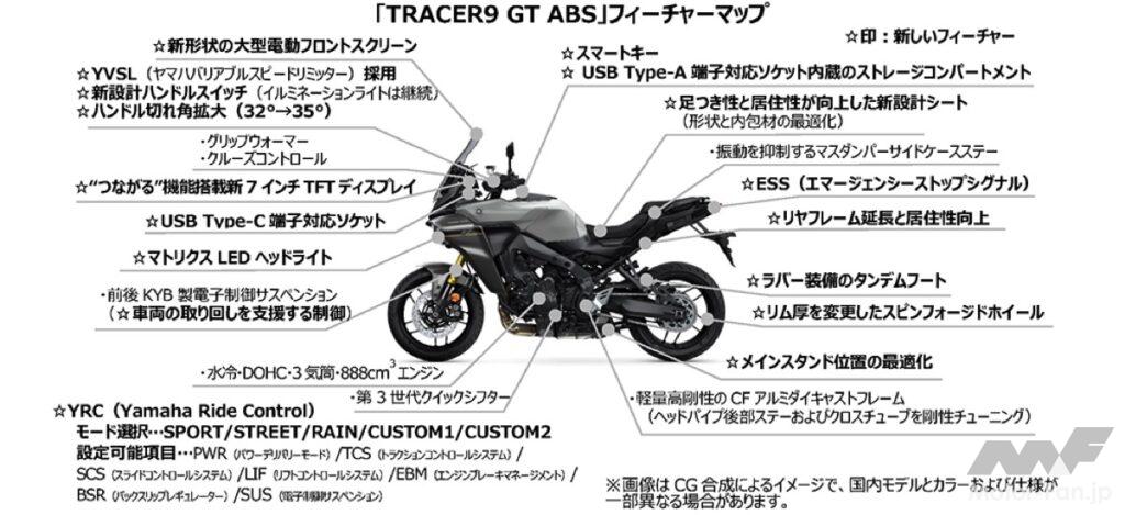 「TRACER9 GT ABS」は、軽量でトルクフルなCP3エンジンと227kgの軽量ボディを組み合わせることで、スポーティかつ軽快な走行性能を実現している。また、ヒップポイントやハンドルバーの角度も変更し、長時間のツーリングや高速道路での走行でも快適性が向上している。