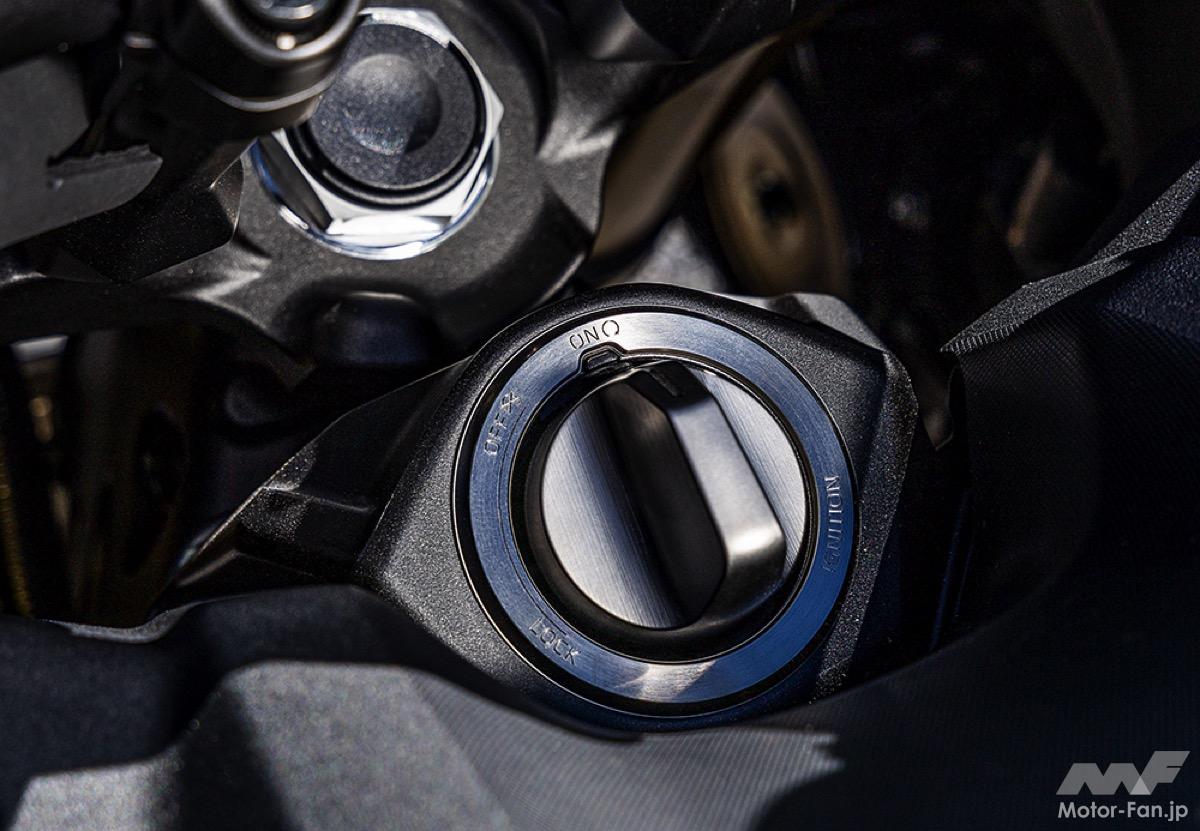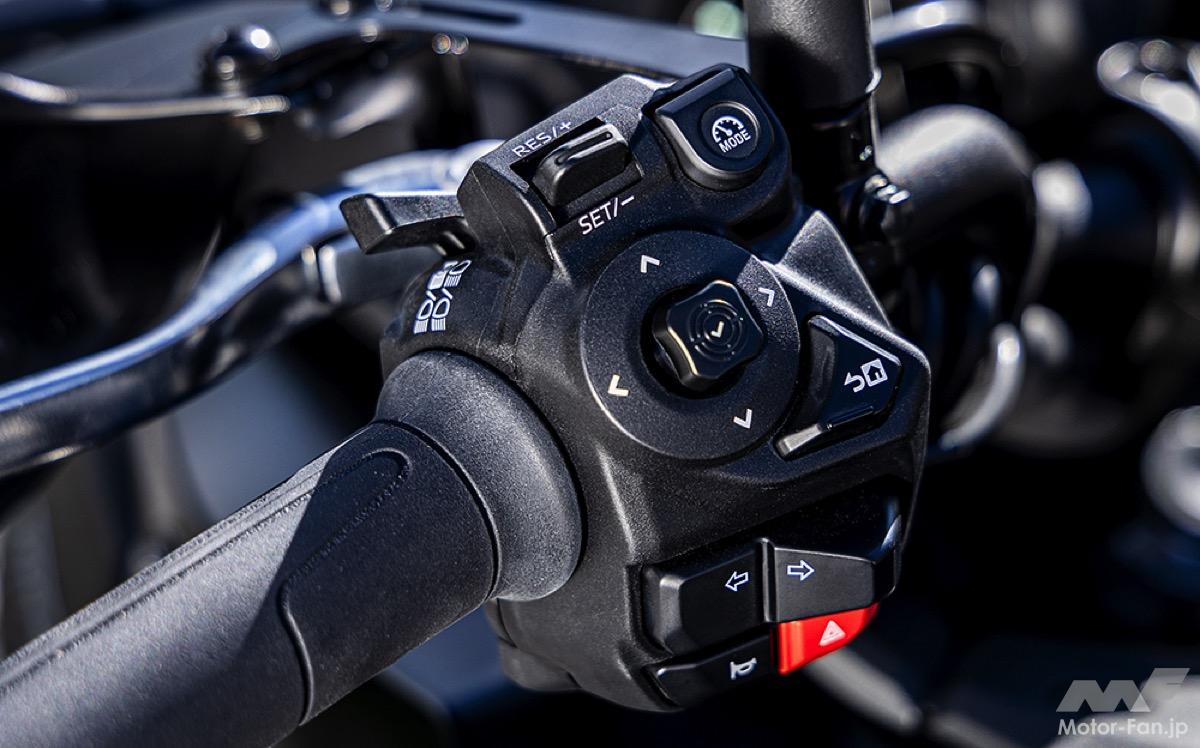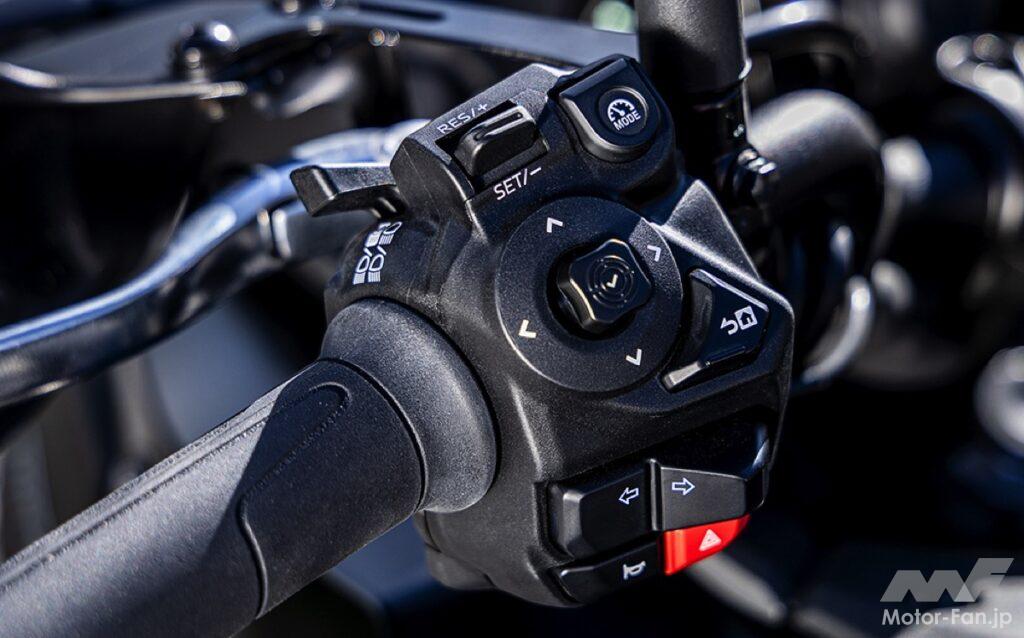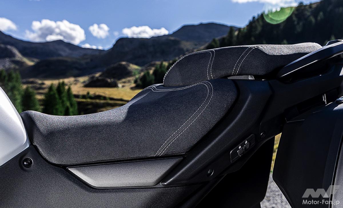 快適性の向上も図られており、100mmの範囲で無段階調整可能な電動スクリーンを搭載している。フロントカウルとスクリーン形状の最適化により、防風効果が高まり、長時間のライディングでも疲労を軽減する設計となっている。シートには高密度クッションを採用し、快適性を高めつつ、燃料タンクに接続する前部を薄くすることで足つき性にも配慮している。さらに、ハンドルの切れ角を32度から35度に拡大し、駐輪場などでの取り回しや旋回が容易になっている。