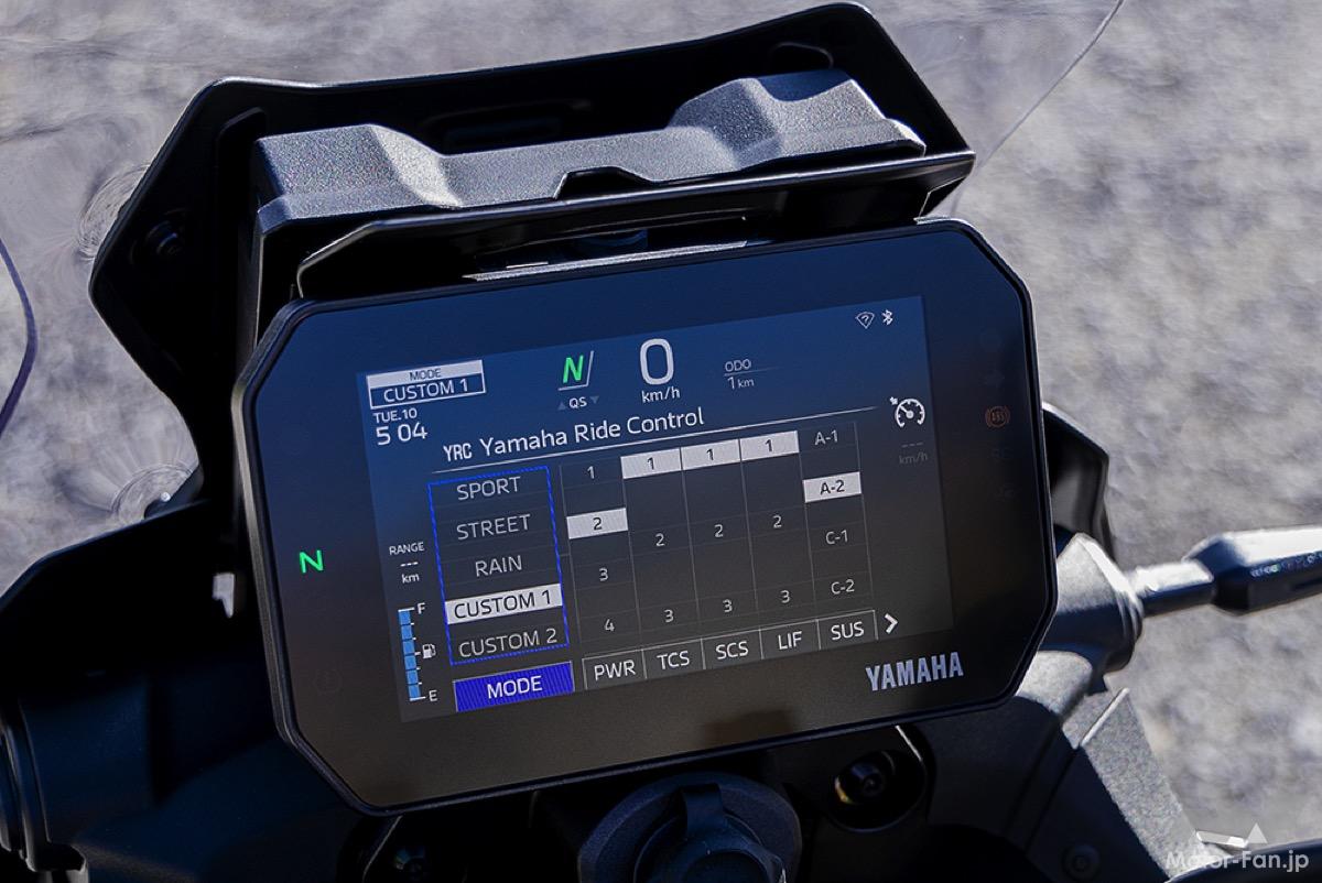 また、走行状況やライダーの好みに応じて走行モードを切り替え可能なYRC(Yamaha Ride Control)を装備している。このシステムにより、走行フィーリングの選択だけでなく、前後サスペンションなどの各種電子制御の介入度も選択可能となり、幅広いシーンに合わせた走行をサポートする。さらに、専用アプリ「Y-Connect」や「Garmin Motorize」をインストールしたスマートフォンと車両を接続することで、ディスプレイにナビゲーションを表示し、目的地までの走行を支援する機能も備えている。