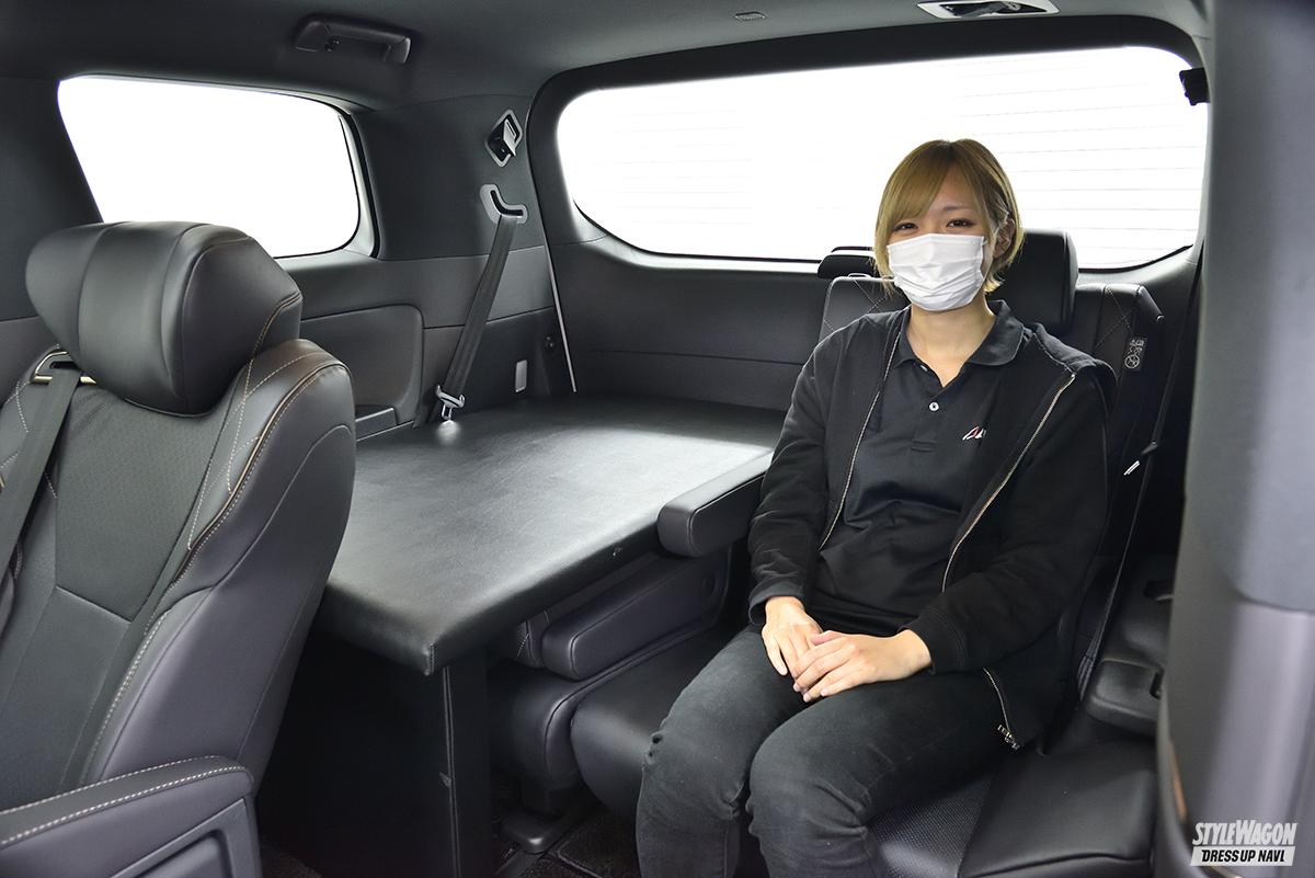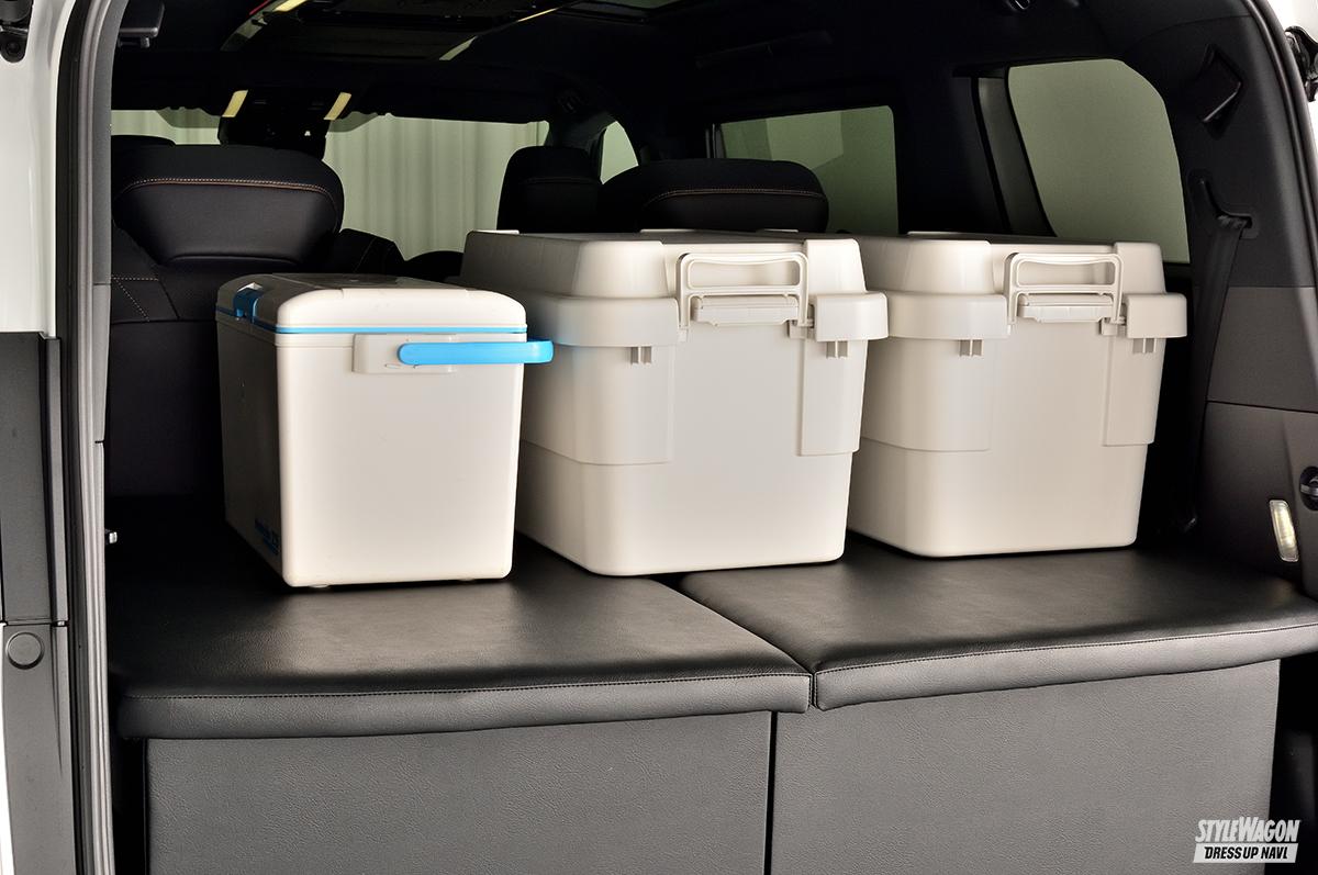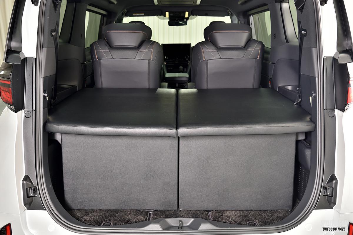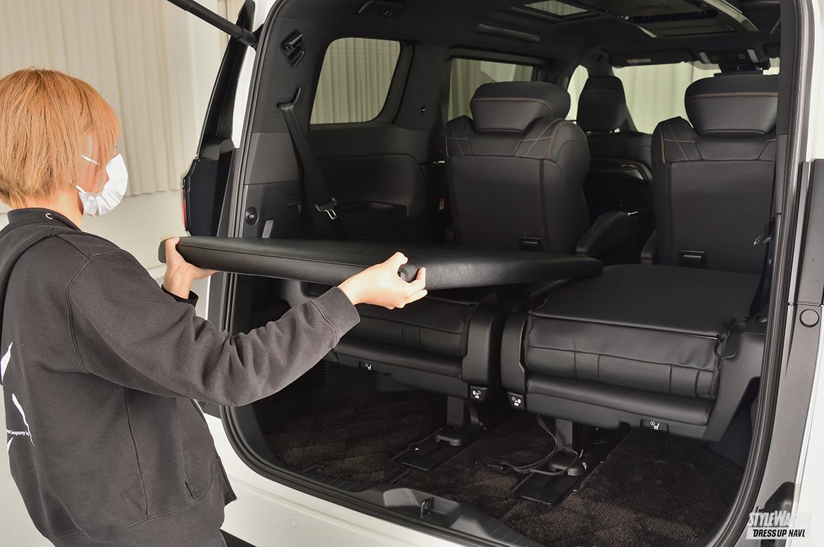 このラゲッジボードは、サードシート部にフラットな収納スペースを生み出し、よりラゲッジの実用性を高めてくれる優れもの。奥行き、横幅、高さともに充分な広さを備えているので、多くの荷物や幅のあるものも積み込める。マットには構造用合板とクッションを採用し、強度もしっかりと確保。上質感のあるレザー仕様なので、車内の雰囲気にもマッチ。2列目シートはラゲッジボードを装着したままでもリクライニングが可能で、足元もゆったり。3列目シートのUSBポートやラゲッジランプも、そのまま使える設計となっている。また、取り付けは工具不要で、誰でも簡単に脱着できる。