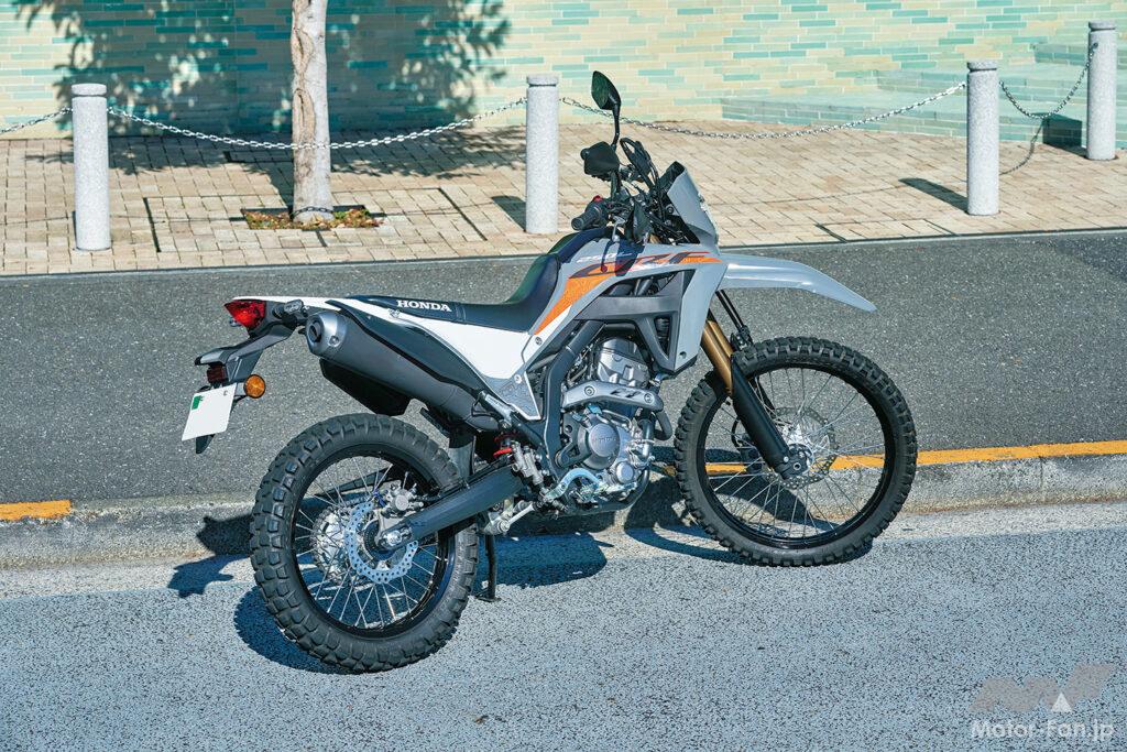 フロント21インチ、金色に輝く倒立フロントフォーク。跳ね上がったテールパートとストイックなグレーの車体。いかにもオフロード車然とした体育会系な趣きのフォルムだ。しかしそのマッチョな出立ちにダマされてはいけない! このCRF250L、実はかなりフレンドリーで敷居の低い「いいヤツ」なのである。