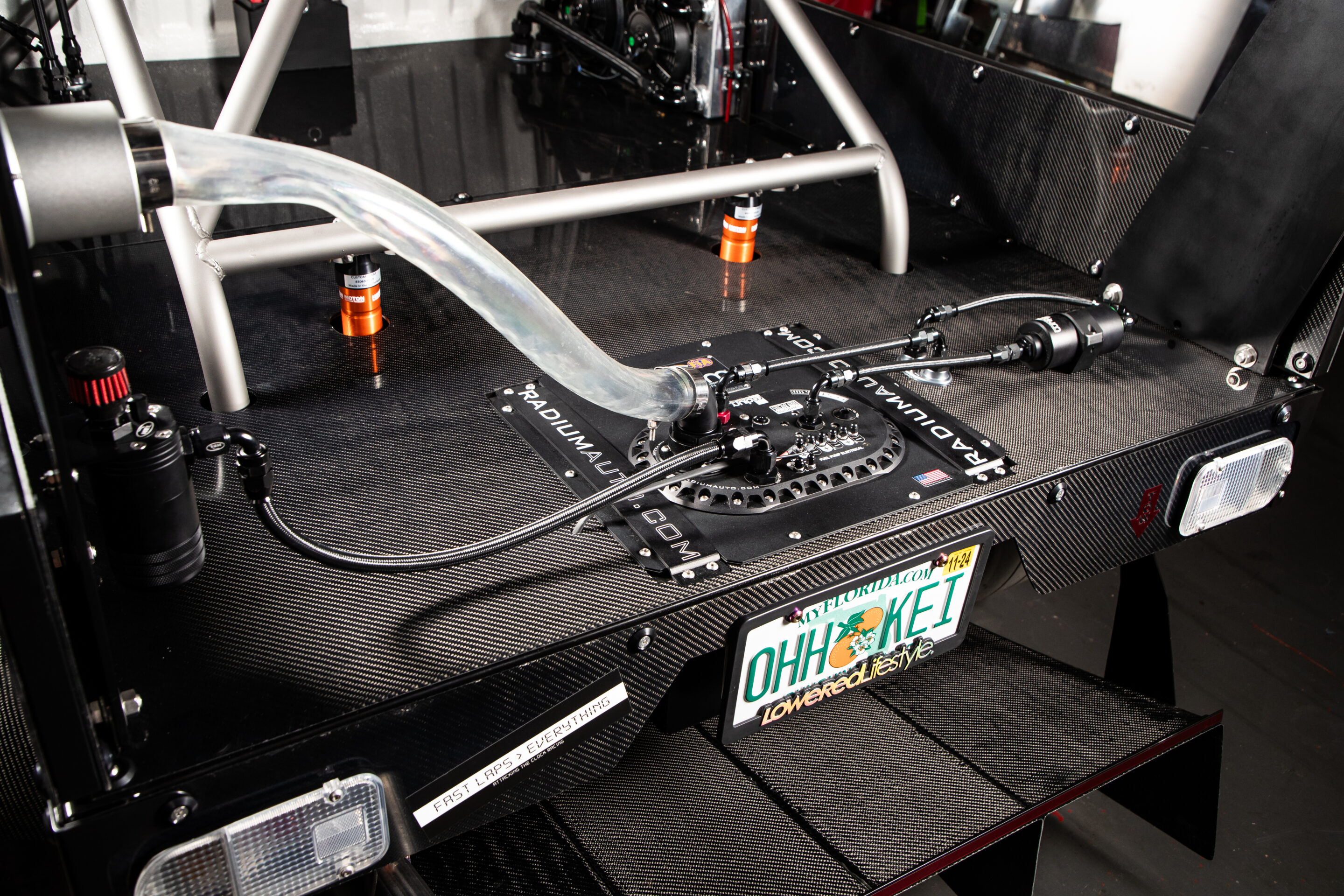 エンジンはスズキハヤブサの1.3Lに換装予定。カーボン製の荷台には、燃料を供給するインタンクコレクター付きのRadium製6ガロンフューエルセルを搭載してある。