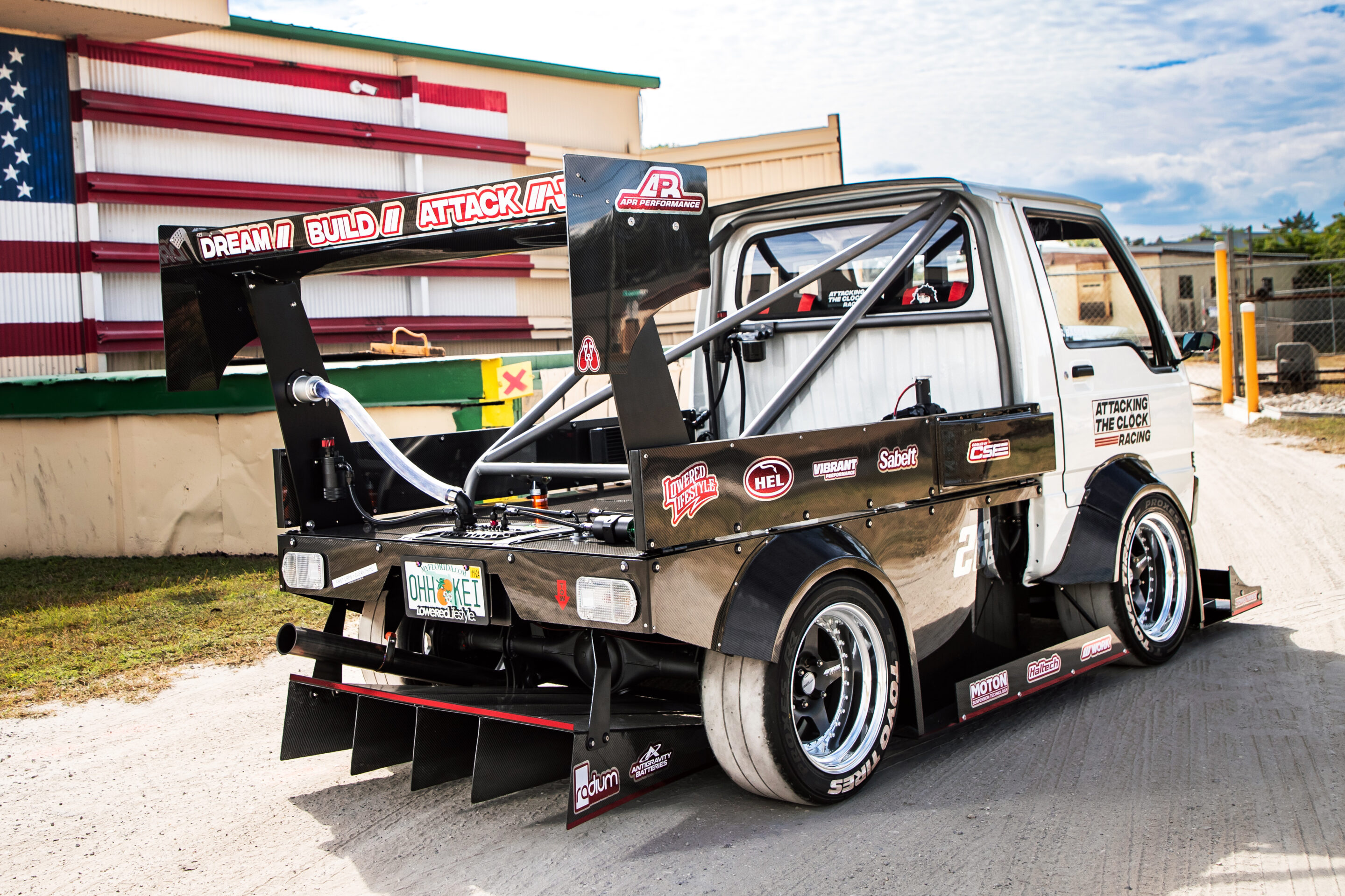 日本伝統のワークホースである“軽トラ”。なぜか最近アメリカで妙に流行っており、一般的には広大な農地の移動手段などとして使われている。だが、我々の知る限りタイムアタックマシンとして使おうとしているのは、フロリダ州でプロショップ『アタッキング・ザ・クロック・レーシング』を経営するショーン・バセットをおいて他にいない。