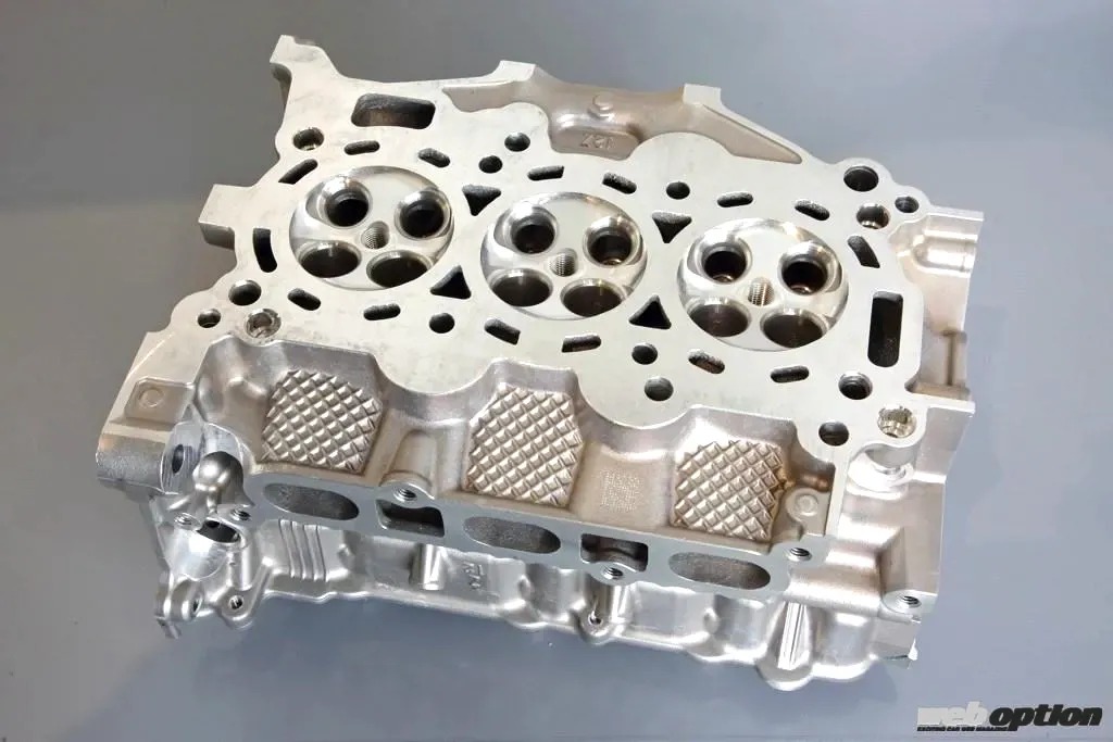 一方のヘッドは、燃焼室マシニング加工仕様となる。スキッシュを削ったフルサークル形状にすると同時に、容積を約1.56cc拡大。ハイブースト対応の高効率燃焼室をマシニングで作るメニューだ。大型タービンの性能を引き出すには不可欠なメニューとなるだろう。