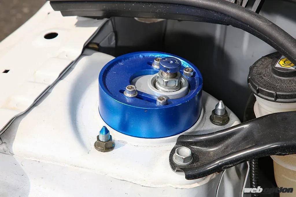 ノーマルに対してポテンシャルが大きく高まっていくと、トータルパッケージングの底上げが重要だ。とくに足回りはフロントのストローク不足がネックとなってくるため、トップフューエルは、ストロークを増やせるアッパーマウント(キャンバー調整式)を用意。そこにトップフューエル・ブルーダンパー(F8kg/mm R10kg/mm)をインストールして旋回性能を高めている。