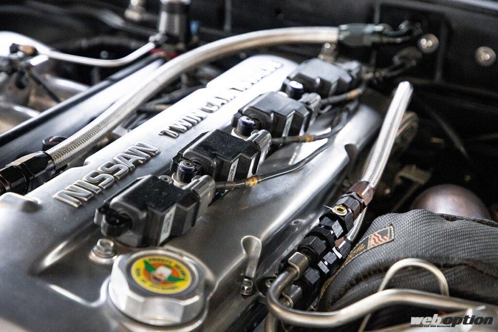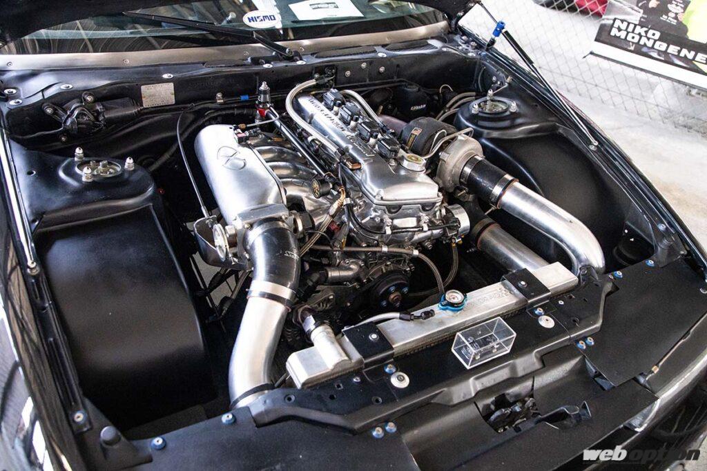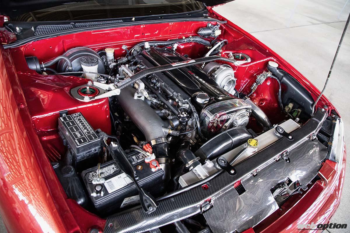 S13型240SXは、アメリカでは180SXと同じリトラ顔が本来の姿となるが、この93年式モデルは固定式ヘッドライトを備えるJDMコンバージョンを実施。エンジンは元々のKA24DE型直列4気筒を搭載しているが、ターボ&ダイレクトイグニッション化するとともに、オリジナルのサイクルフェンダーを備えた美しいエンジンルームを実現している。