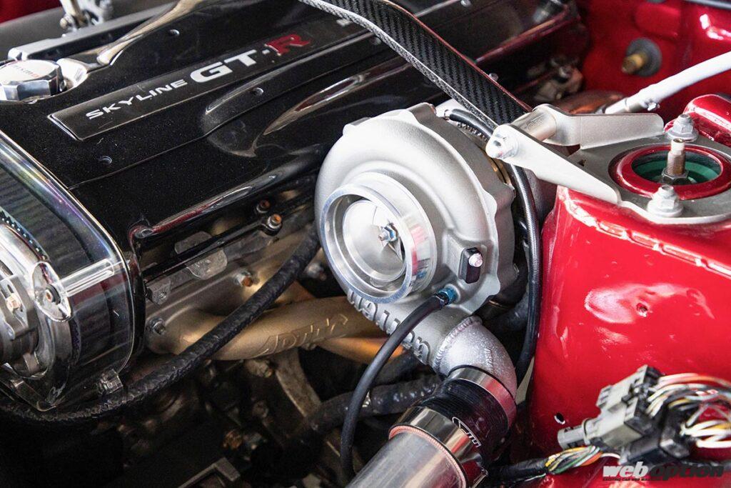 シングルターボ化されたRB26DETTには、オーストラリアのARTECがリリースするリバースローテーション用鋳造マニホールドを装着。ギャレットなどが展開している、一般的なタービンとはハウジングが逆回転となるリバースローテーションタービンをマウントする。