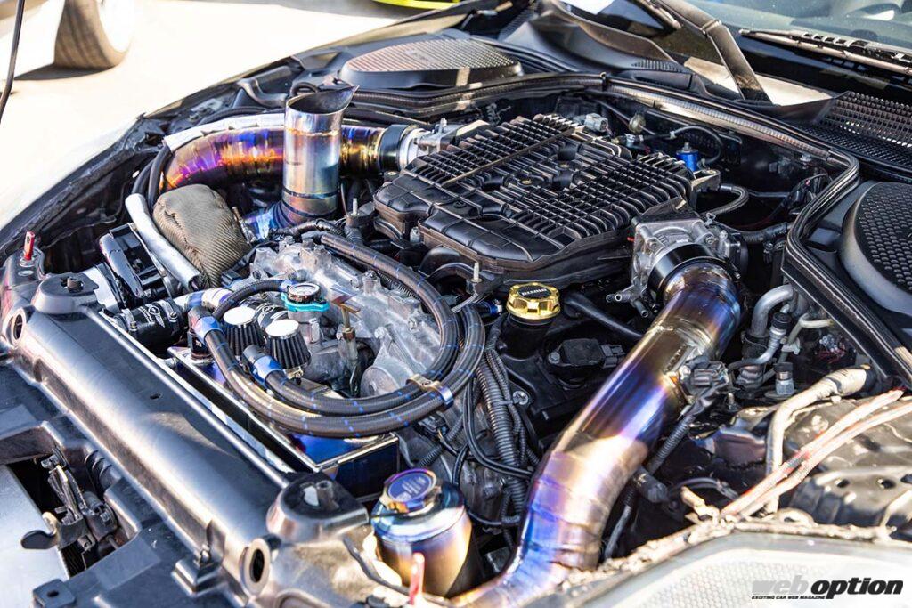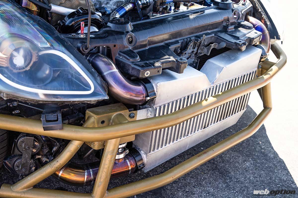 前後にバッシュバーを備え、巨大なインタークーラーとリヤのドラッグタイヤを誇示。その一方で、エンジンルームはチタンのパイピングやPTFEホースなど、「魅せる」意識も感じさせる。